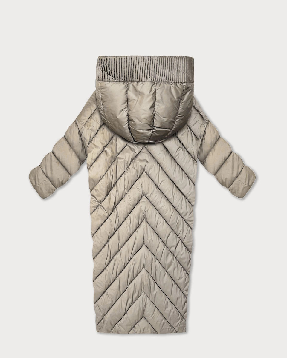 Bunda je prošívaná, je zateplená syntetickou péřovou výplní, má dvě kapsy a zapíná se dvousměrným zipem a panelem s patentkami. Model má kapuci, kterou není možné odepnout. Bunda má délku ke kolenům.