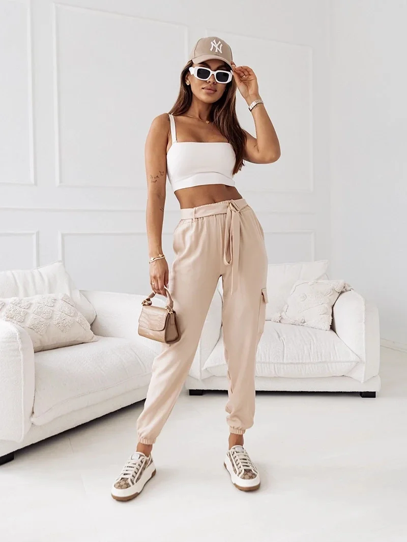 Kalhoty mají středně vysoký sed a střih, mají čtyři kapsy a v pase mají gumu. Dlouhé nohavice jsou volné.