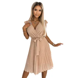 Béžové dámské plisované šaty s výstřihem a volánky model 18526728 - numoco