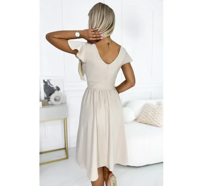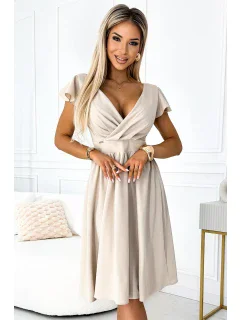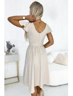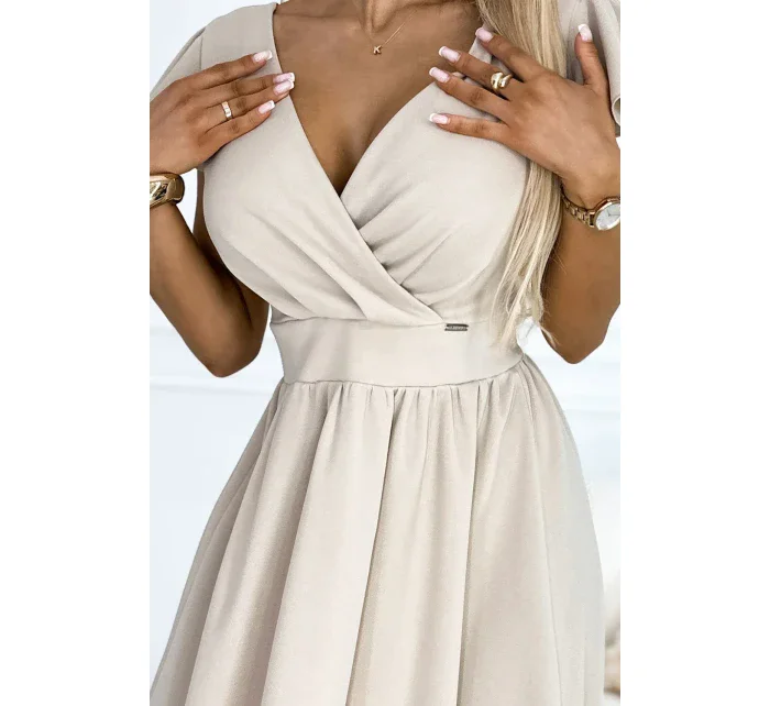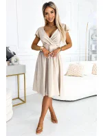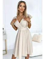Béžové dámské šaty s výstřihem a krátkými rukávy model 19466315 - numoco