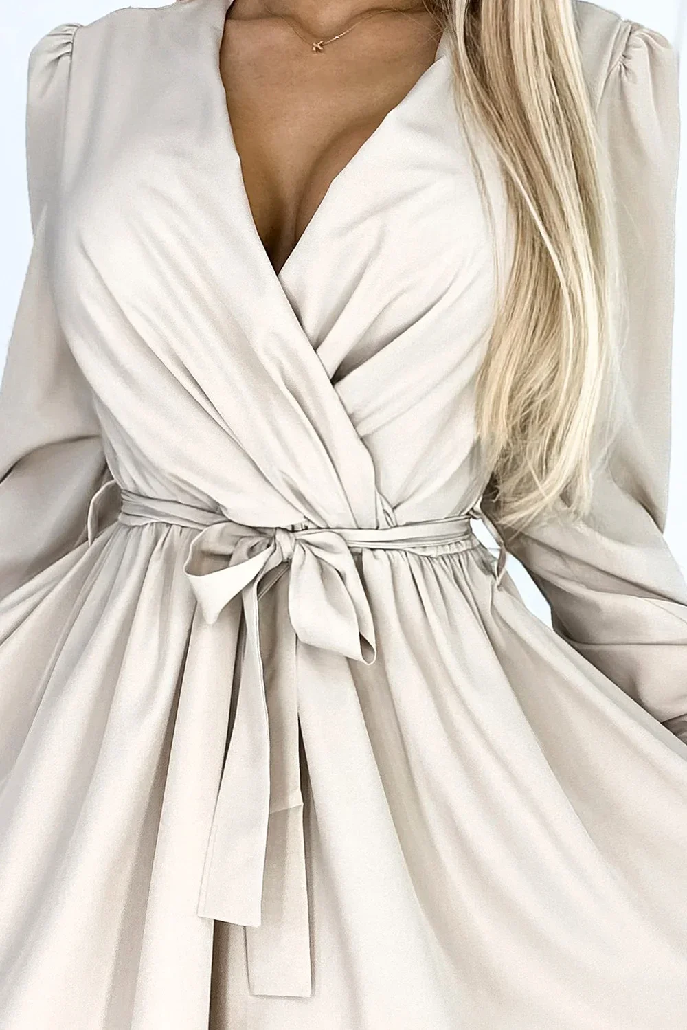 Model má v pase zavazování. Rukávy jsou olemované gumičkami. Tyto šaty značky Numoco jsou polským výrobkem a jsou k dostání v béžové barvě.