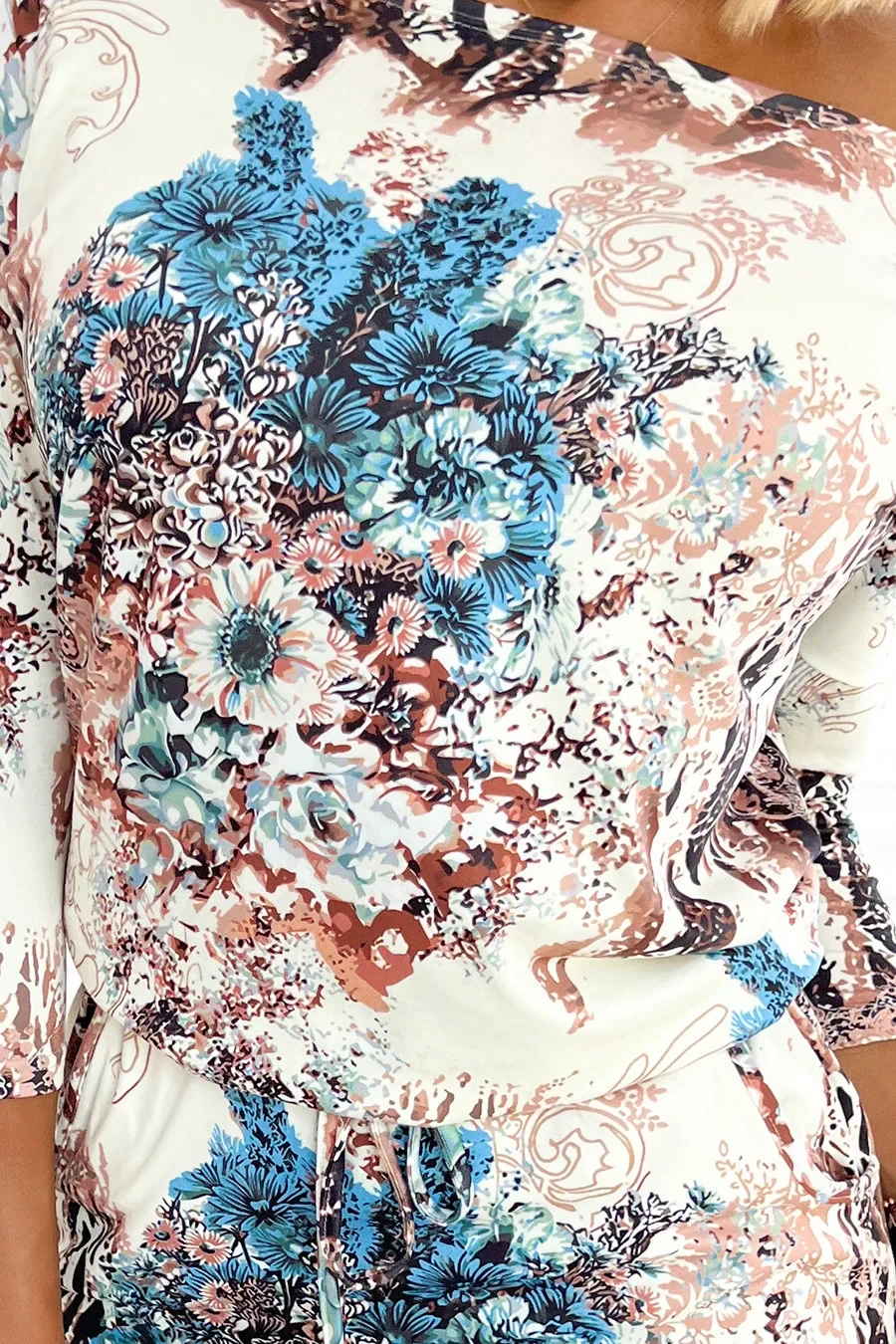 Model je ušitý z pružného materiálu příjemného na dotyk s lehce semišovou strukturou. Tyto šaty značky Numoco jsou polským výrobkem a jsou k dostání v béžové barvě se vzorem světle modrých květů.