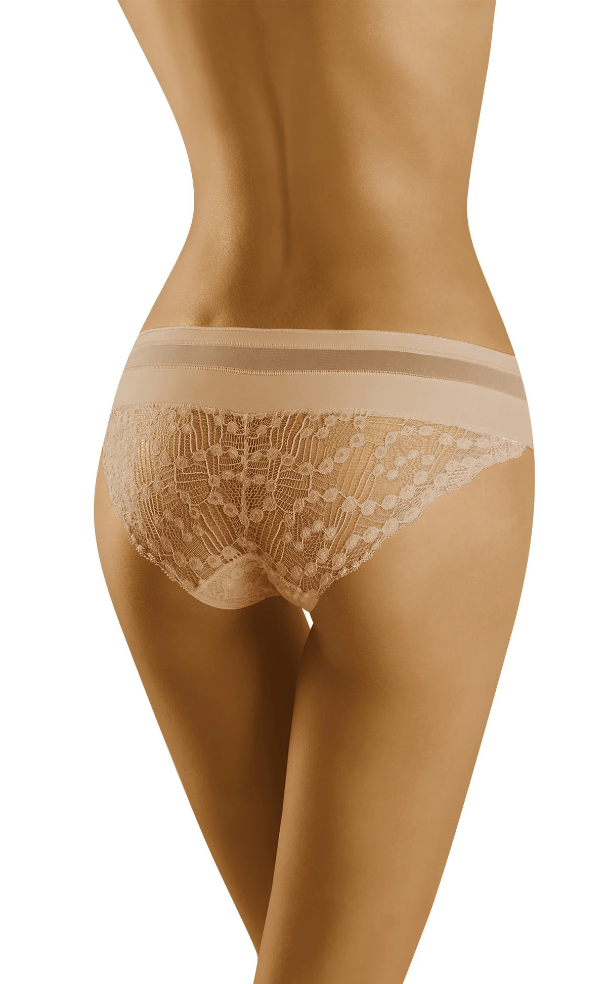 Pohodlné kalhotky z prolamované zdobené krajky. S širším elastickým pasem. Krásné, ženské a kvalitní. Květinové, prolamované vzory s jemným průsvitným efektem. Složení: 83 % polyamid, 17 % elastan.