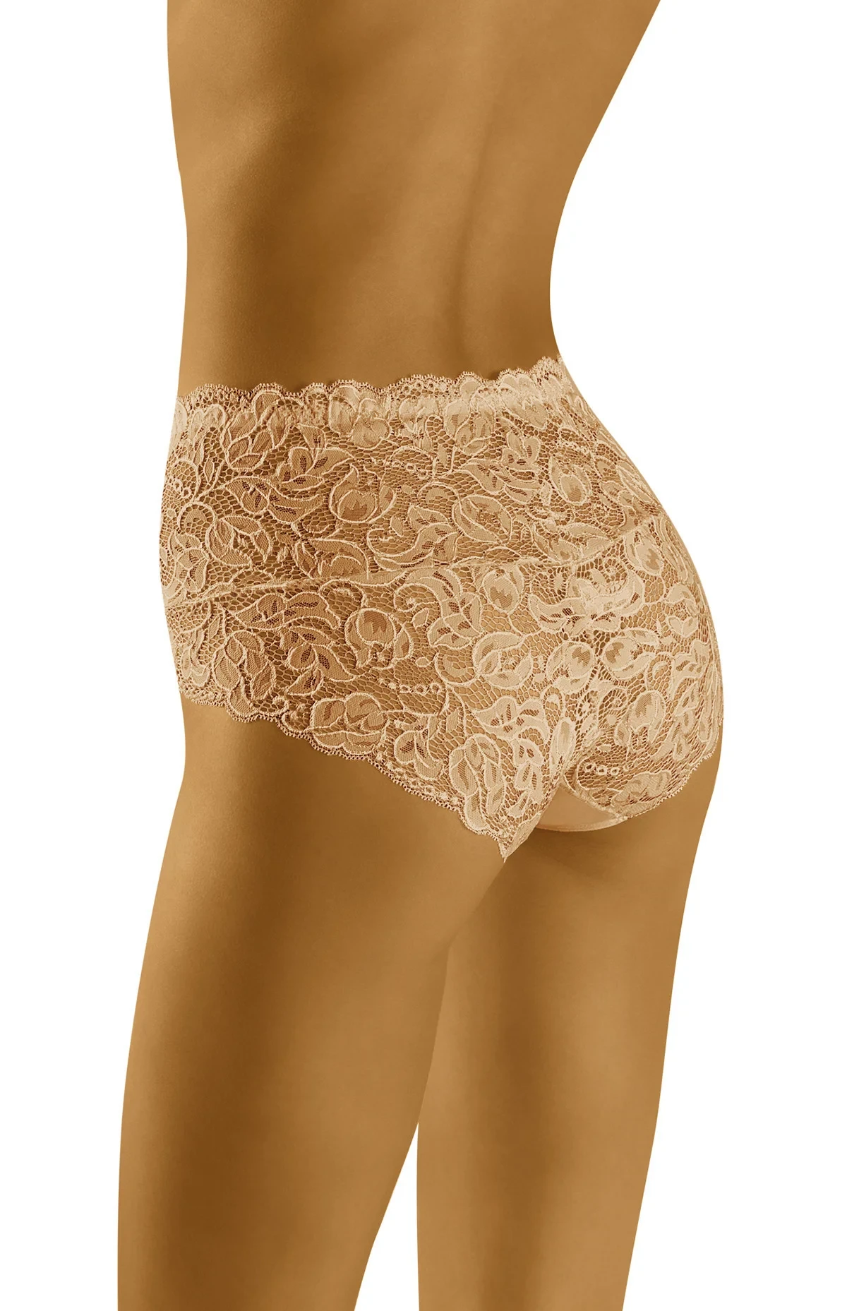 Krajkové kalhotky s vyšším pasem, které vám poskytnou pohodlí a krásný, velmi ženský vzhled. Měkké a pružné, v pase na jemné gumičce. Složení: 83 % polyamid, 17 % elastan.