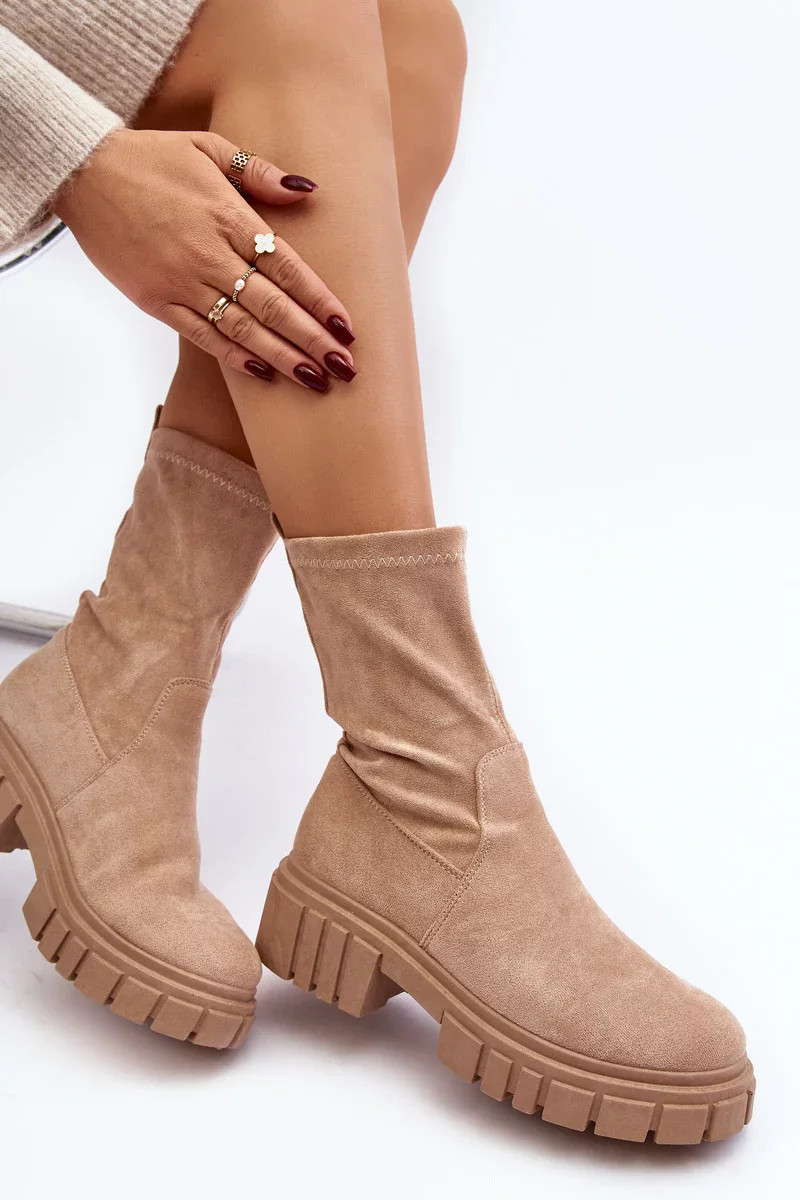 Dámské nazouvací kotníkové boty z eko semiše. Nasazené na masivním plochém podpatku a platformě. Nezateplené. Měkká stélka zajišťuje pohodlí při používání. Podpatek v této obuvi je vyztužený. Tento model lze sladit s mnoha podzimními styly! Při výběru velikosti se řiďte tabulkou velikostí.