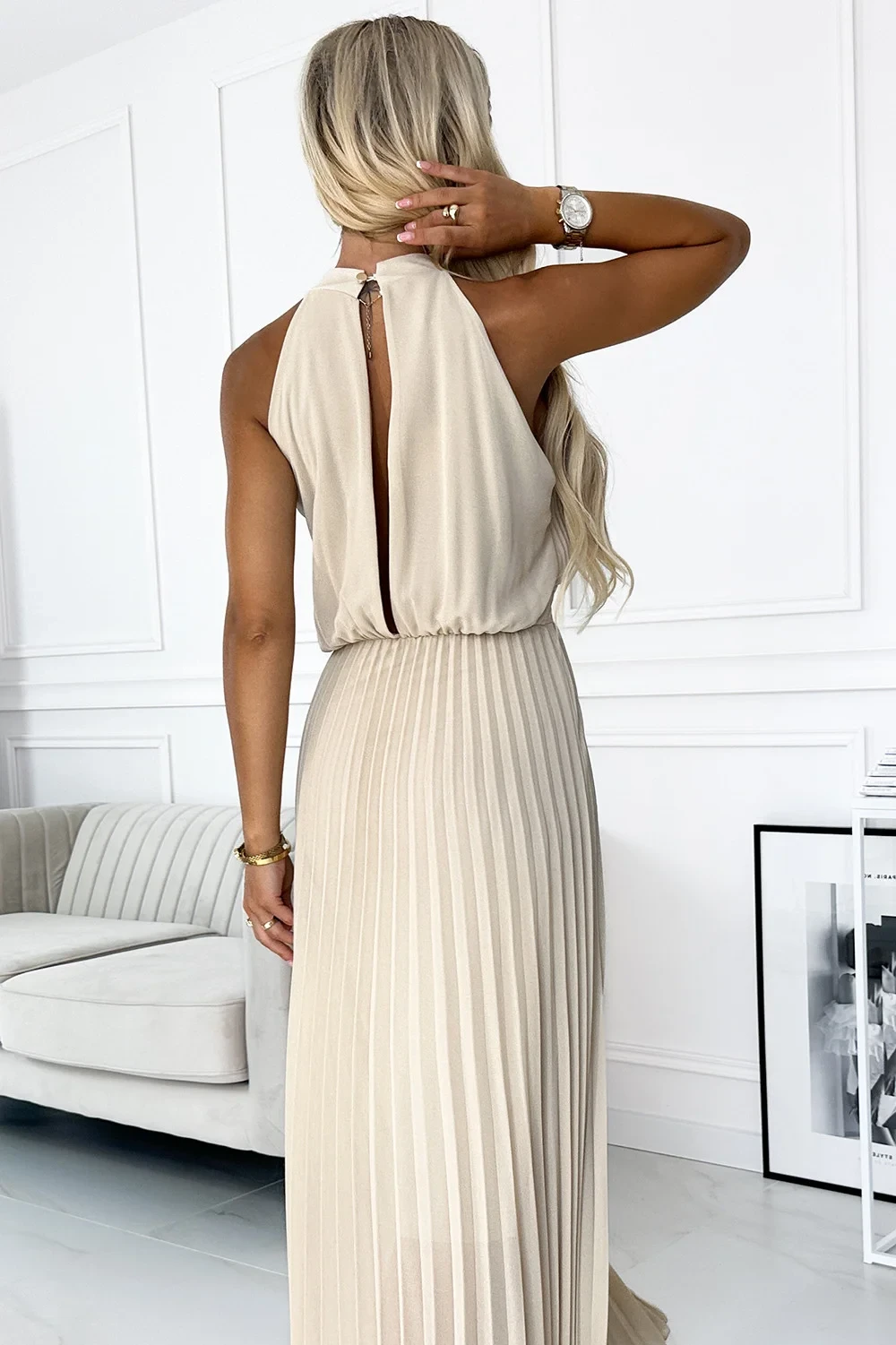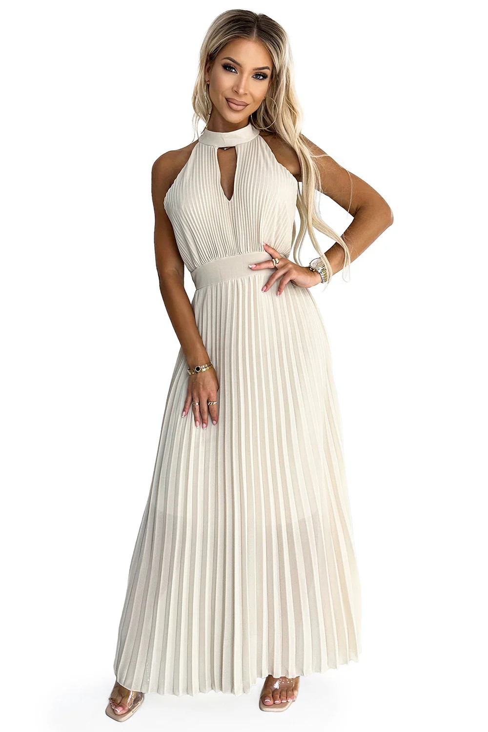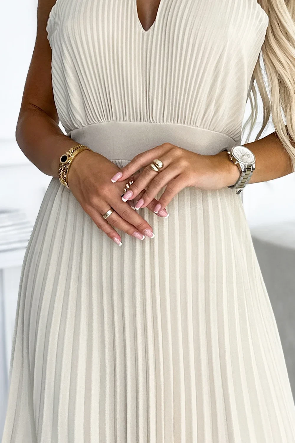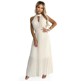 3. Béžové plisované dámské midi šaty s ve tvaru ve výstřihu model 22064814 - numoco basic