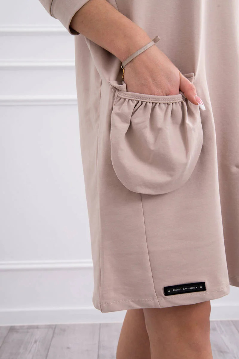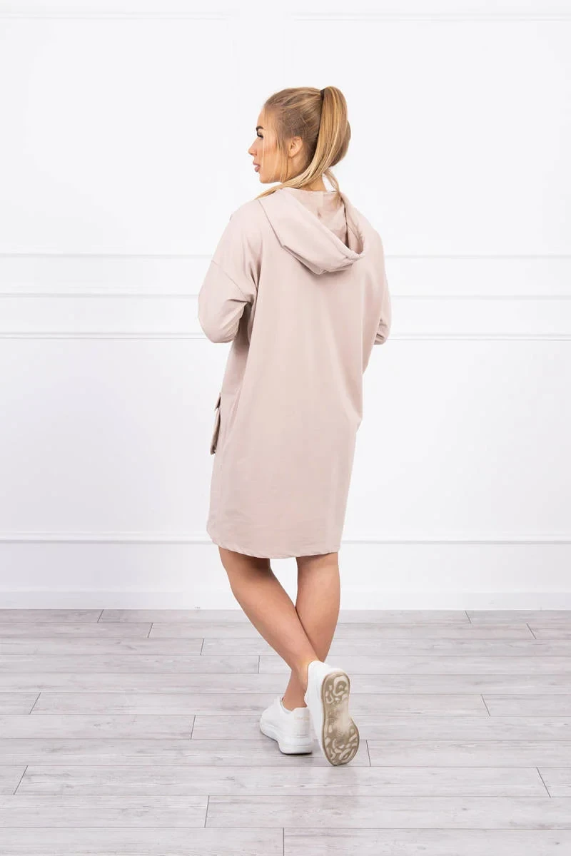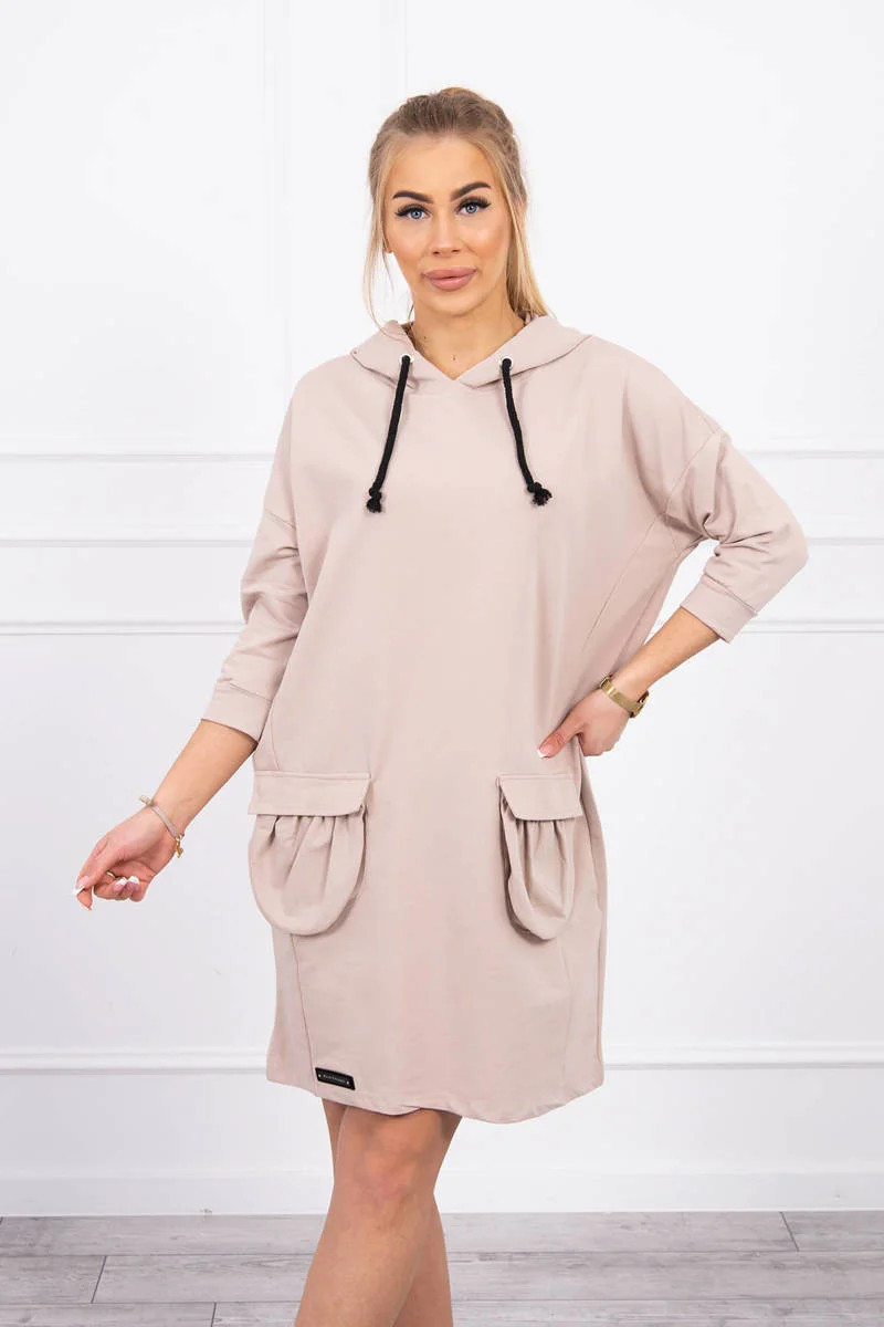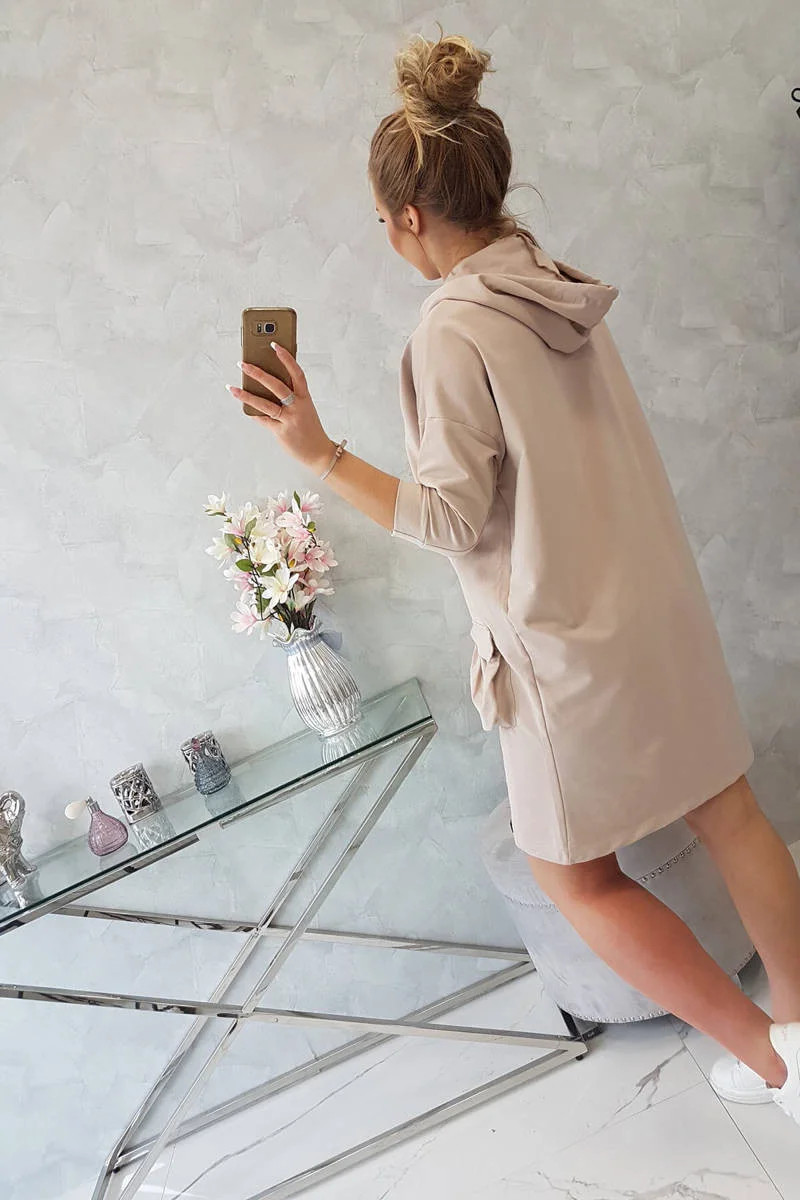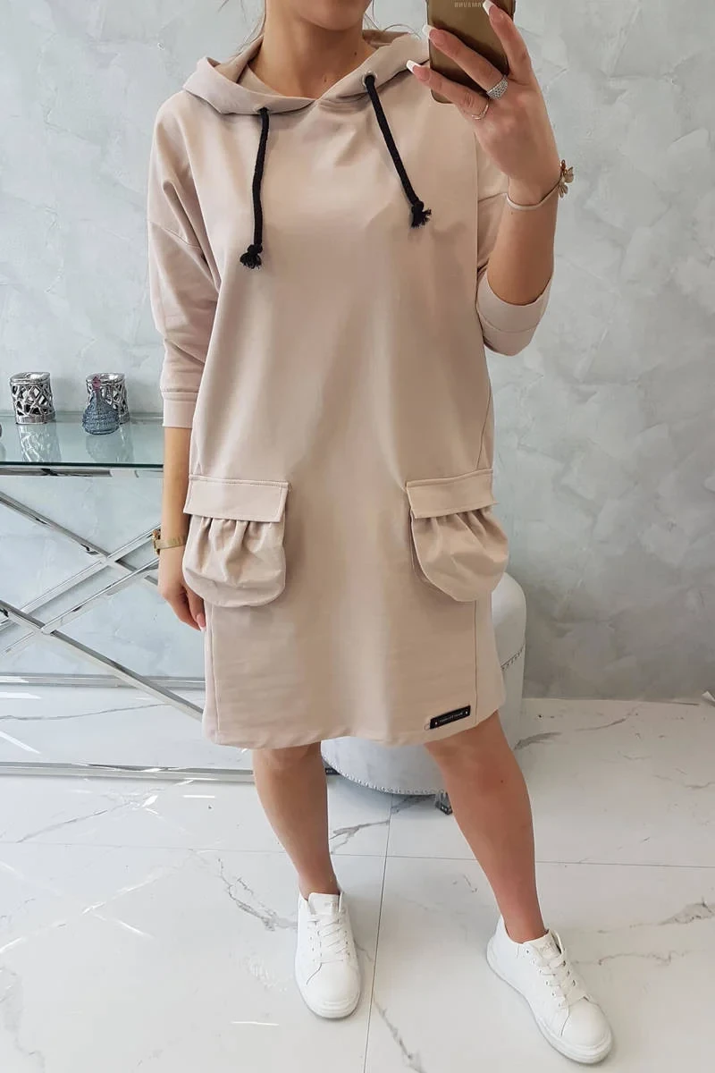 Prezentujemy Państwu wygodną sukienkę. Sukienka z kapturem oraz naszytymi kieszeniami z przodu. Sukienka nie posiada nadruku dzięki temu sprawdzi się w wielu stylizacjach. Sukienka wykonana jest z wysokiej jakości materiału. Rozmiar jest uniwersalny i będzie odpowiedni dla Pań noszących rozmiar S, M lub L.
