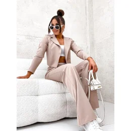Béžový dámský komplet krátké sako a široké kalhoty model 19763935 - Moon