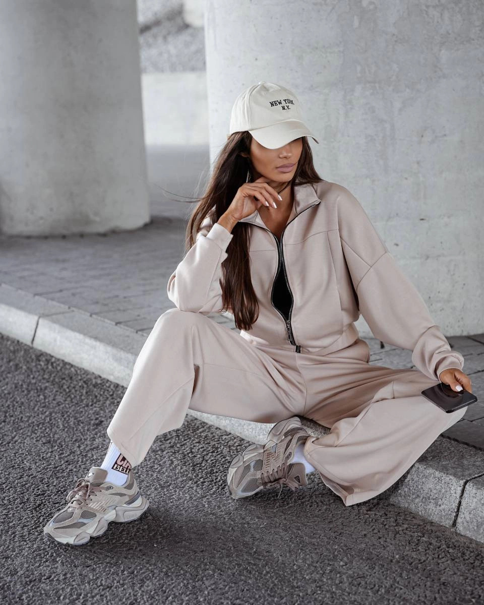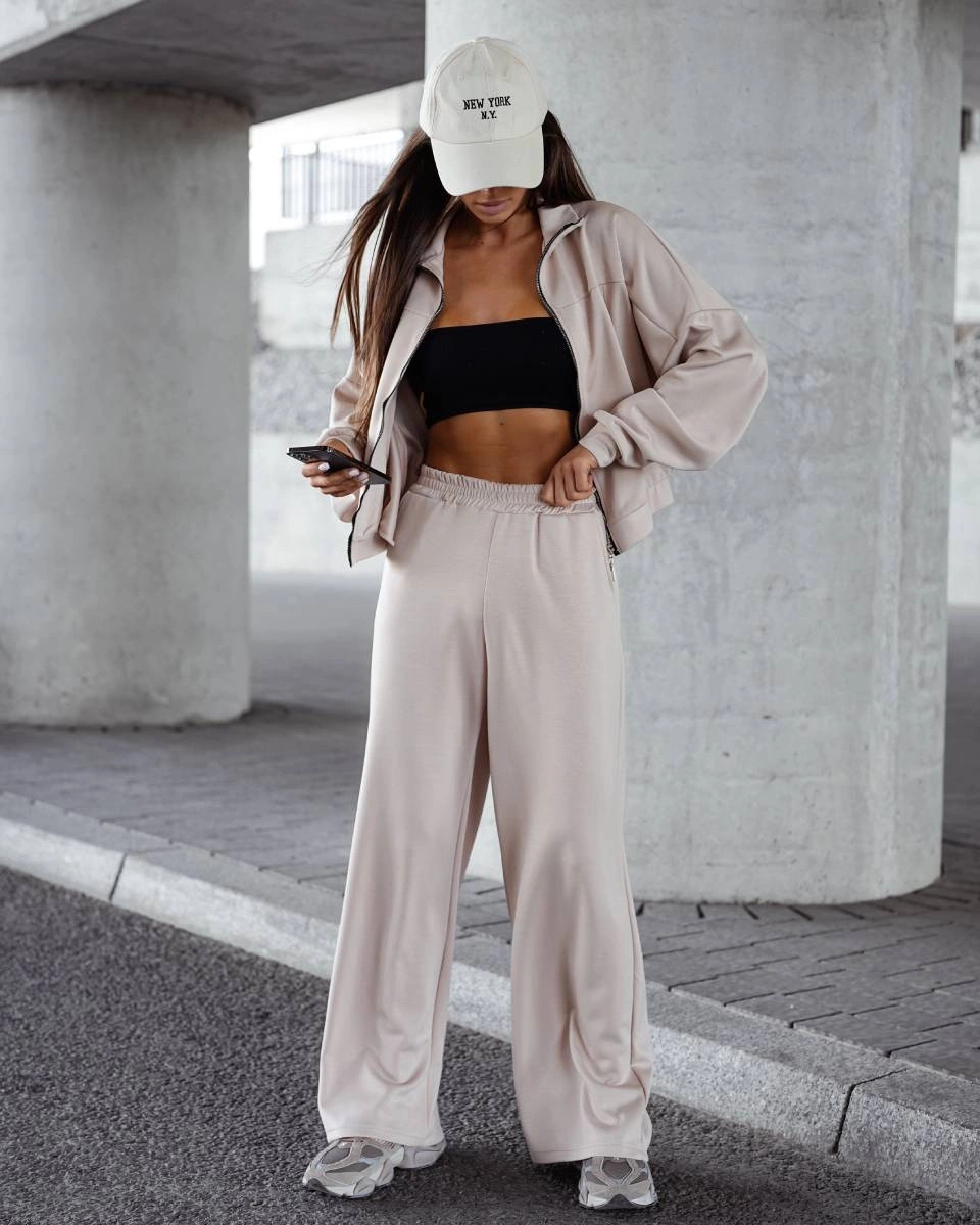 Přidání recenze k Béžový dámský komplet - mikina se stojáčkem a široké kalhoty (821109)