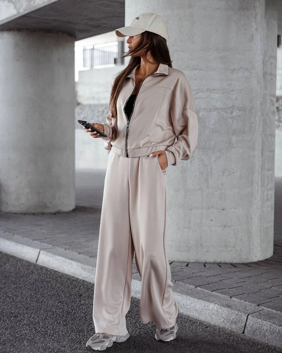 Béžový dámský komplet - mikina se stojáčkem a široké kalhoty (821109)