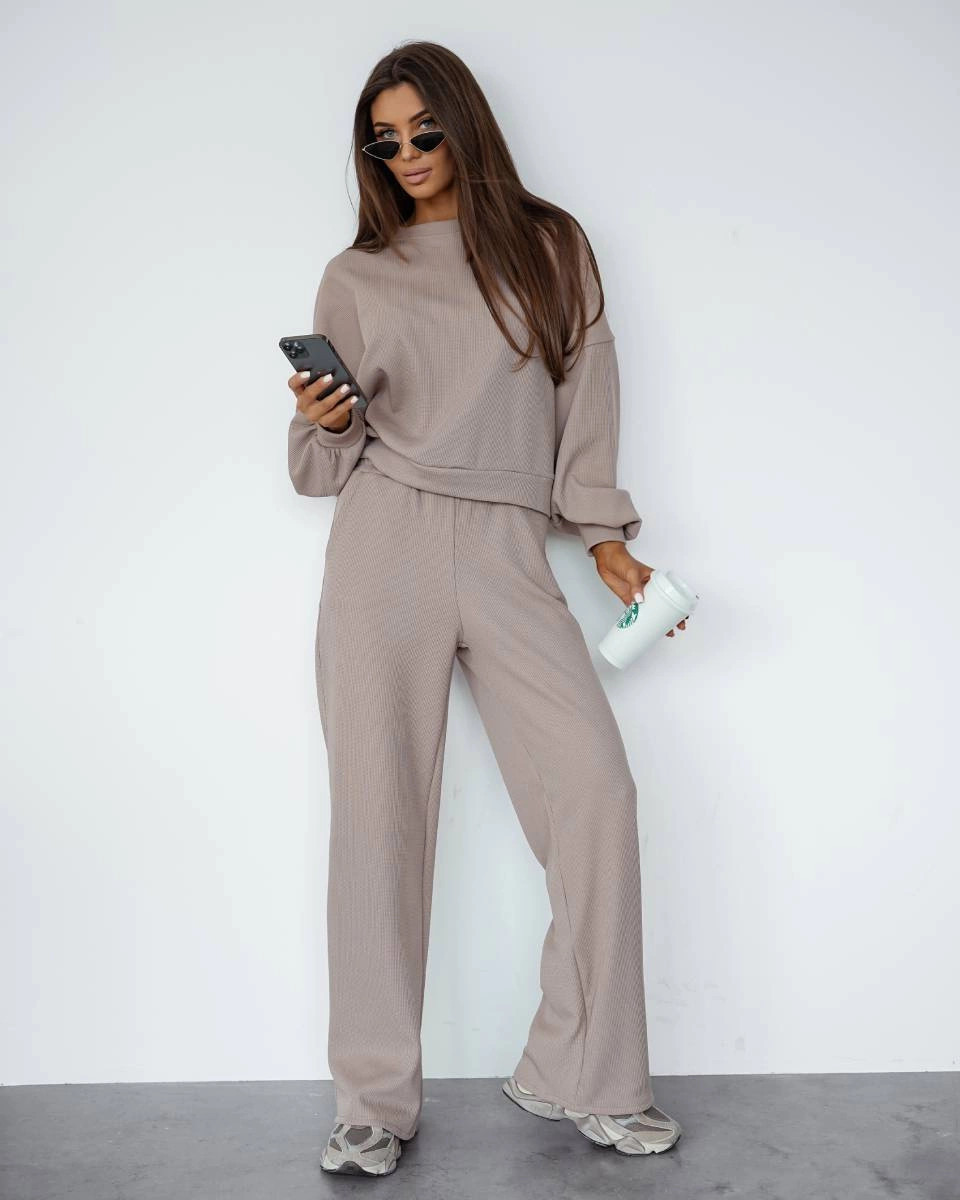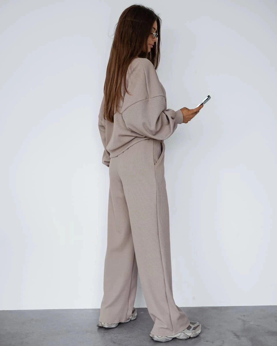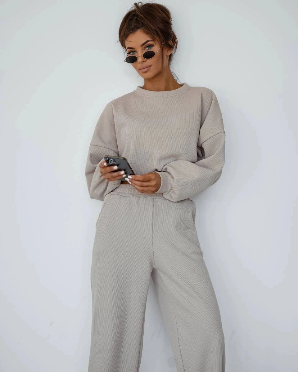 Komplet, který se skládá z mikiny a širokých kalhot.
