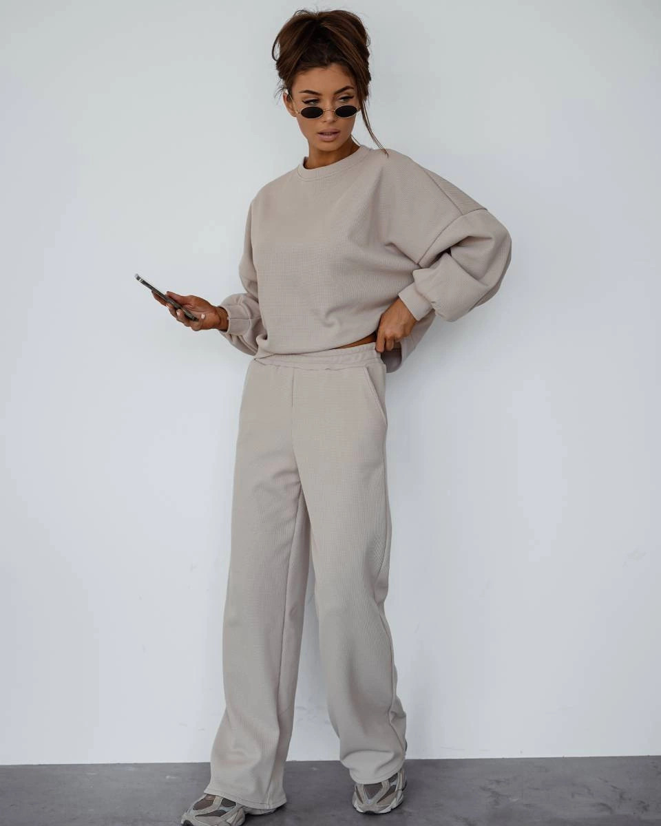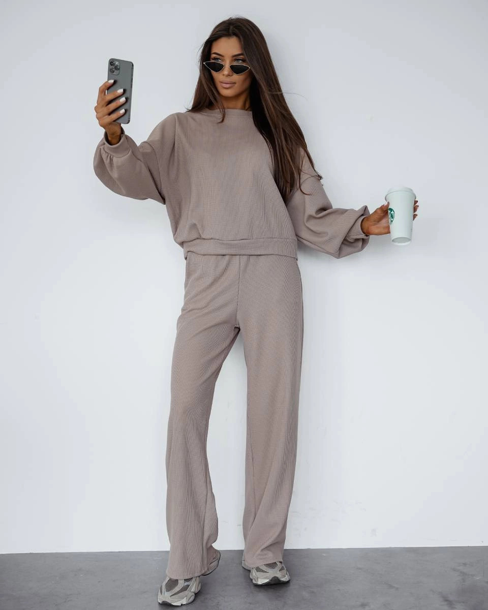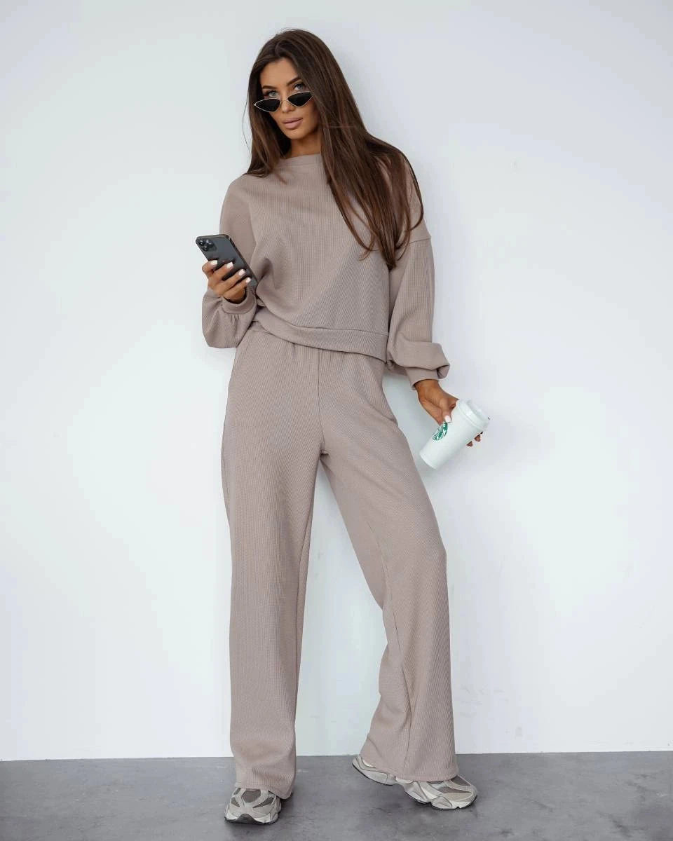 Komplet, který se skládá z mikiny a širokých kalhot.