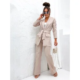 Béžový dámský komplet - volné sako a široké kalhoty (8167)