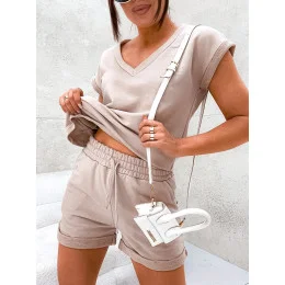 Komplet, který se skládá z volné halenky a krátkých šortek.