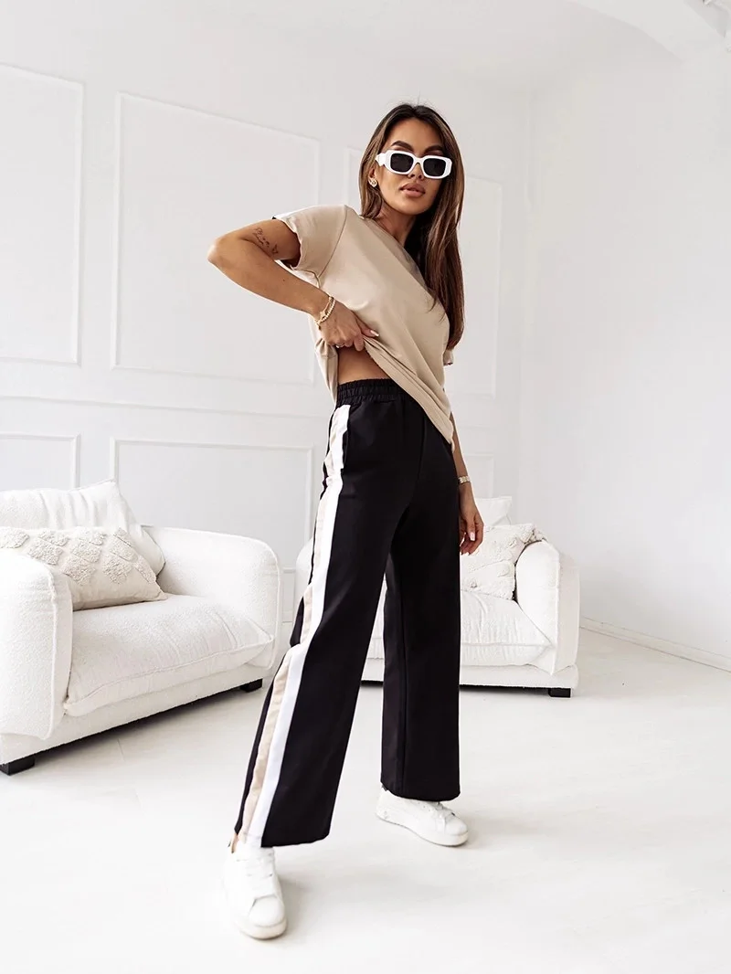 Komplet, který se skládá z trička a širokých kalhot.