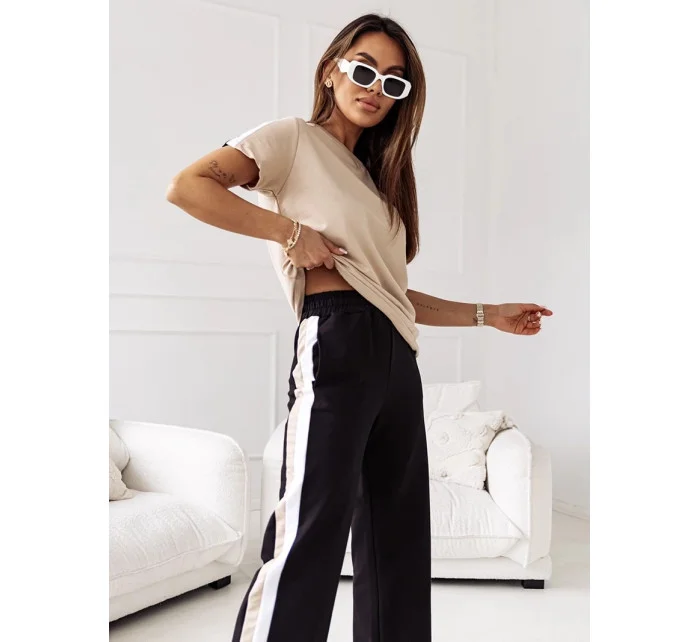 Béžový dámský sportovní komplet - oversize tričko t-shirt a teplákové kalhoty (VE89)