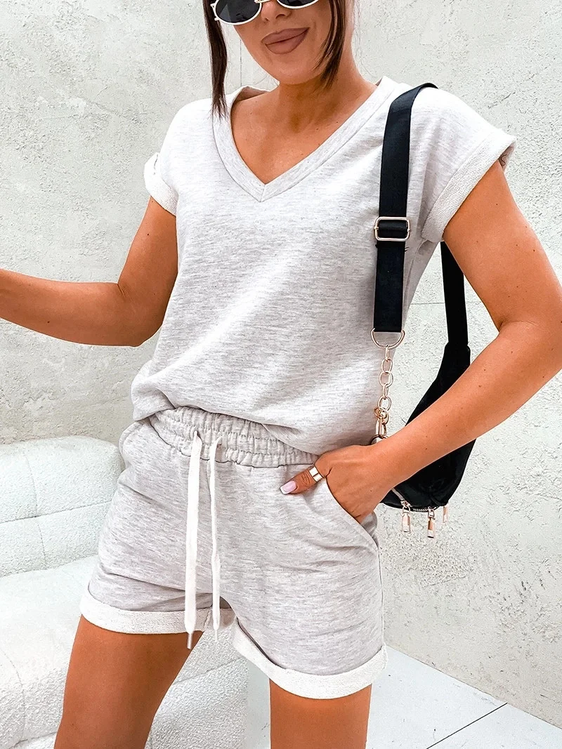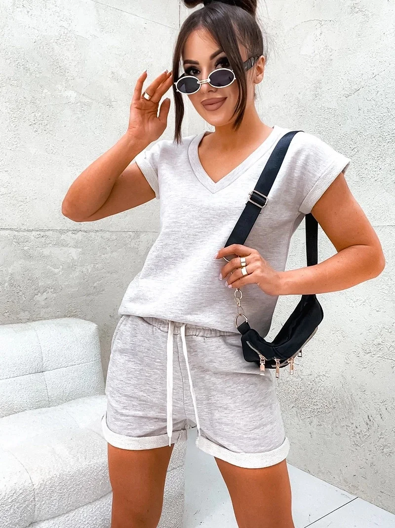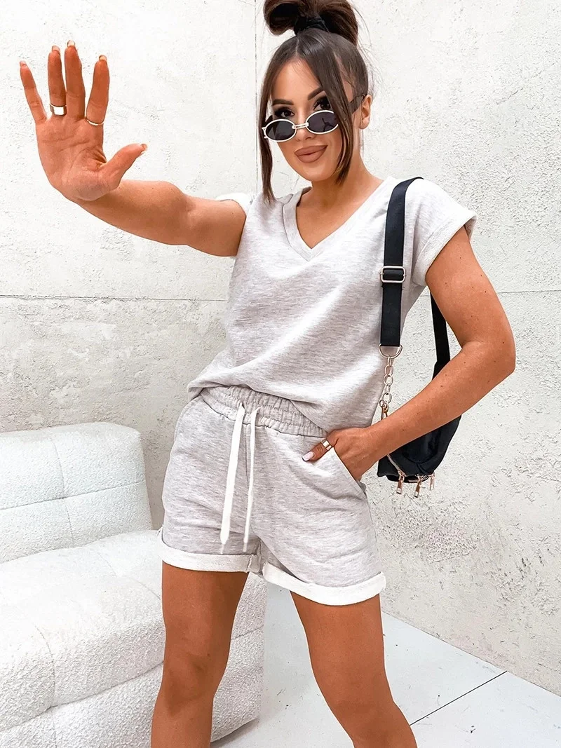 Komplet, který se skládá z volné halenky a krátkých šortek.