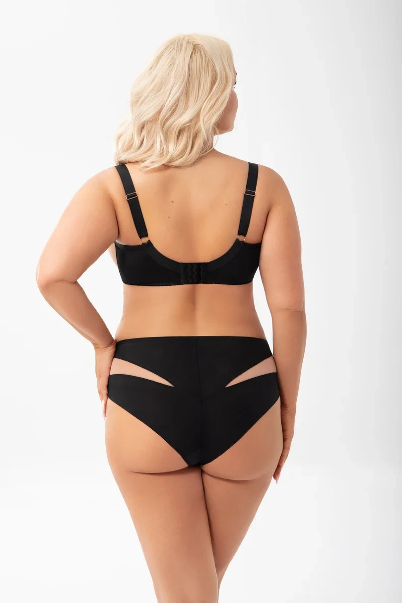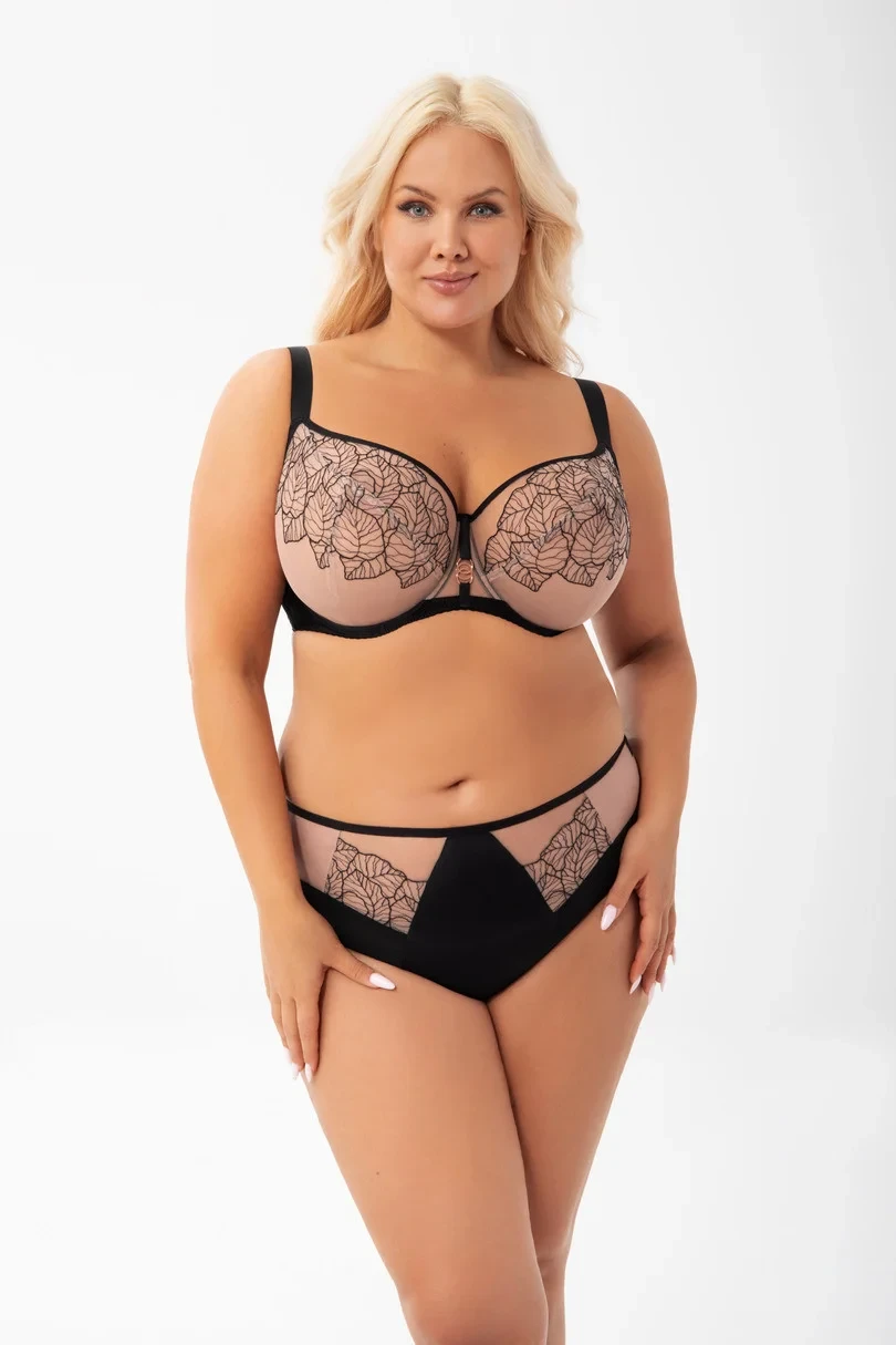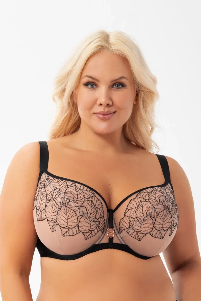 Měkká podprsenka určená pro ženy se středně velkými, velkými a velmi velkými prsy. Poskytuje efekt velmi silného zvednutí a shrnutí poprsí dovnitř, 3dílné košíčky z výšivky podšité stabilním tylem. Pro větší pohodlí je horní okraj pásu zakončen měkkým lemováním. Horní okraj košíčku plynule přechází do ramínka, což způsobuje lepší oporu poprsí. Na kostici ozdobný prvek v barvě růžového zlata. Zadní díl z neprůhledné lycry vysoké gramáže a pružnosti pro větší pohodlí. Boční velrybí kostice zabraňující sjíždění látky. V závislosti na velikosti dvouřadý nebo třířadý háček s třístupňovou regulací obvodu. Neodnímatelná, nastavitelná ramínka ve třech šířkách. Kovy v barvě růžového zlata (bez niklu)