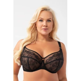 Biustonosz miękki przeznaczony dla kobiet ze średnim, dużym oraz bardzo dużym biustem. Zapewnia efekt zaokrąglenia i zebrania biustu do środka,4-częściowe miski z panelem bocznym wykonane z haftu podszytego tiulem stabilnym. Podniesiona linia dekoltu, wykończona delikatnie połyskującą taśmą. Tył z transparentnej lycry zapewniającej bardzo dobre dopasowanie i podtrzymanie. Fiszbiny boczne zapobiegające zwijaniu się materiału. W zależności od rozmiaru dwu lub trzyrzędowa haftka z trójstopniową regulacją obwodu. Nieodpinane, regulowane ramiączka w czterech szerokościach. Metalowe elementy w kolorze różowego złota (nie zawierają niklu)