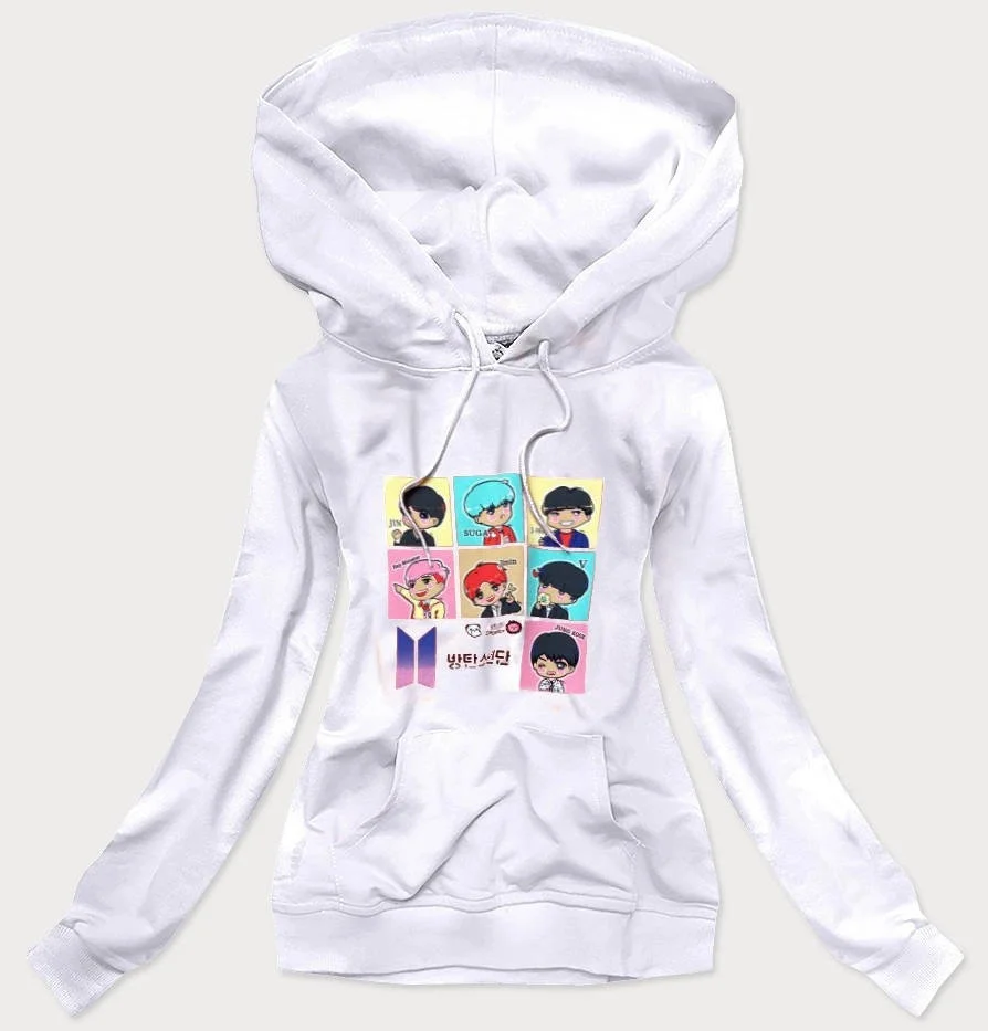 Mikina má volný střih, délku k bokům a obléká se přes hlavu. Rukávy a spodní okraj modelu jsou olemované stahovacími lemy. Model má jednu "klokaní" kapsu.