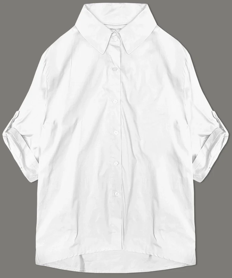 Halenka má volný střih, má límeček, ohrnuté 3/4 rukávy a zapíná se knoflíky. Spodní okraj modelu je asymetrický. Délka předního dílu košile sahá pod boky a délka zadního dílu do poloviny stehen.