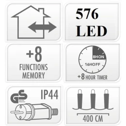 Tento světelný řetěz má 576 diod LED uspořádaných v mřížce o průměru 5,5 mm, což zaručuje brilantní světelný efekt, který jistě upoutá pozornost a vytvoří nádhernou slavnostní atmosféru.