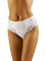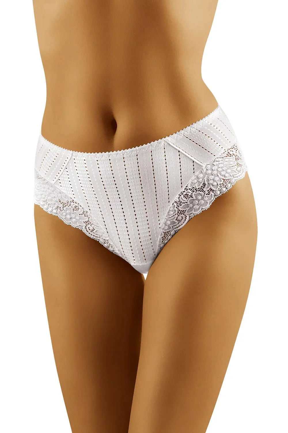 Elegantní kalhotky s krásným krajkovým lemem kolem stehen, mírně plnější, s elastickými vlastnostmi a módní pruhovanou mozaikou, která hravě zdobí přední část prádla.