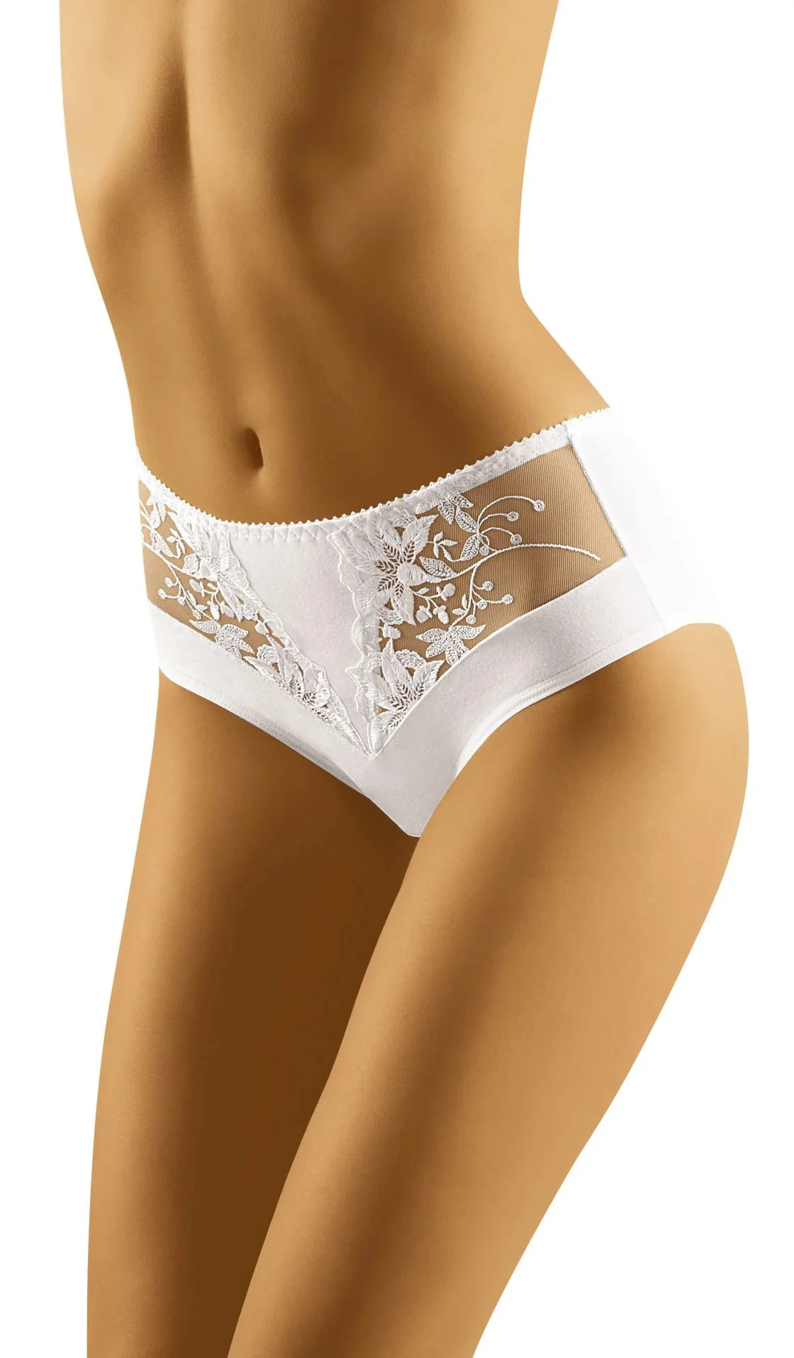 Modelovací kalhotky s vyšším sedem. Dobře zakrývají drobné nedokonalosti postavy, zplošťují "boky" a korigují linii boků. Hladké, na přední straně zdobené výšivkou a průhlednými vsadkami. Pohodlné, dobře se přizpůsobí tvaru těla - neomezuje v pohybu. Složení: 90 % bavlna, 7 % elastan, 3 % polyamid.