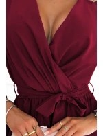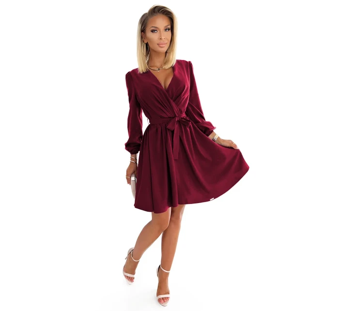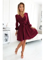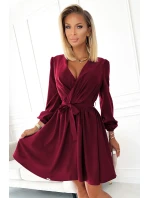 Model má v pase zavazování. Rukávy jsou olemované gumičkami. Tyto šaty značky Numoco jsou polským výrobkem a jsou k dostání ve vínové bordó barvě.