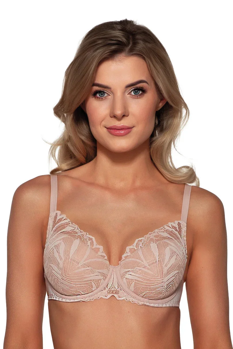Podprsenka s vyztuženými push-up košíčky doplněná měkkými vycpávkami je celá pokrytá složitě tkanou krajkou. Jemně se překrývající košíčky a ozdobný můstek krásně zvýrazňují dekolt. Teplá béžová a ušlechtilá černá položené na pěně tělové barvy vypadají velmi vkusně, zatímco jemná ecru potěší svým půvabem. Aby byla sada kompletní, nezapomeňte si k ní pořídit tanga kalhotky nebo klasické plné kalhotky.