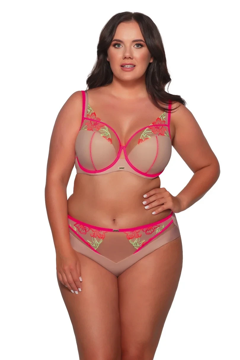 Biustonsoz półusztywniony, miseczki od wewnątrz wyścielone zostały miękką pianką dla optymalnego kształtowania piersi, na zewnątrz zaś pokrywa je cielisty tiul przecięty różowym szwem oraz niebanalny kwiatowy haft w energetycznych odcieniach wyciągnięty poza miski. Różowe lamówki tworzą swoistą ramę biustonosza, a dwukolorowe ramiączka i haftowane wstawki rozpięte między ramiączkiem a miseczką dodają lekkości i uroku. Bestsellerowa konstrukcja należycie zadba o zebranie i uniesienie biustu, a także o jego komfortowe podtrzymanie, a fikuśne figi świetnie uzupełnią całość. Zakochaj się w barwnej Tropei!