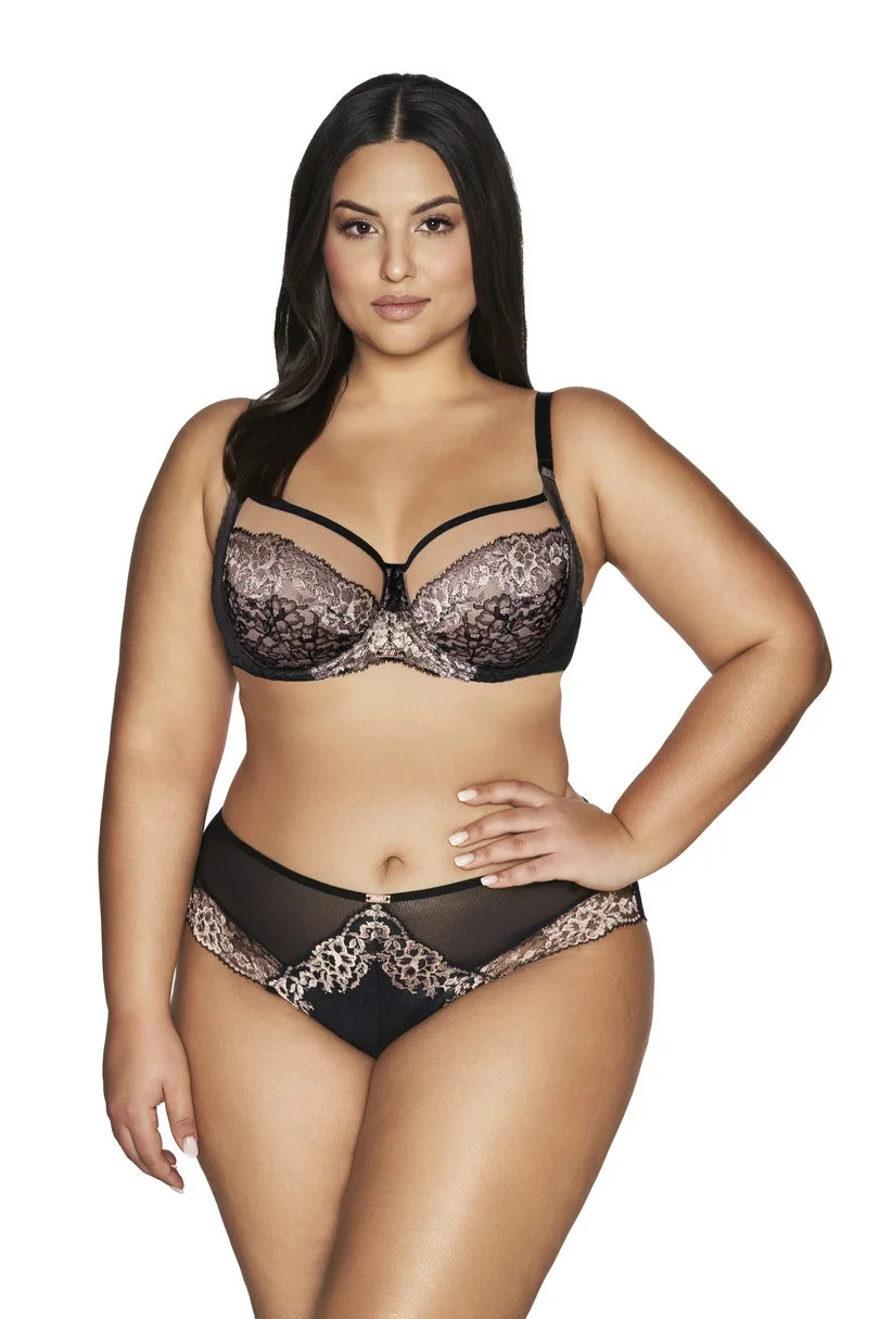 Biustonosz miękki. Sprawdzona konstrukcja z panelem bocznym unosi i zbiera piersi ku sobie, stabilnie je podtrzymując. Jasna koronka z perłowym połyskiem pięknie komponuje się z klasyczną czernią, uwypuklając krągłość biustu, a ozdobny mostek i zalotne prześwity dodają modelowi lekkości. Poczuj delikatne muśnięcie AV 2095 na własnej skórze!