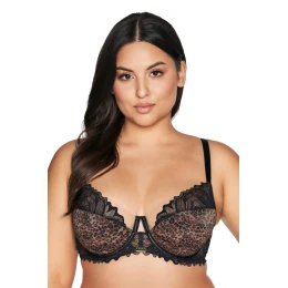 Miseczki, wykonane z półusztywnianej konstrukcji K-1030, tworzą harmonijną kompozycję z cętkowaną dzianiną, bogato tkana czarna koronka i delikatny, cielisty tiul. Te elementy perfekcyjnie kształtują biust, nadając mu atrakcyjny wygląd i podkreślając kobiece krągłości. Dwudzielny obwód nie tylko utrzymuje biust w odpowiednim miejscu, ale także dodaje mu subtelnego uroku.