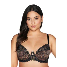 Miseczki, wykonane z półusztywnianej konstrukcji K-1030, tworzą harmonijną kompozycję z cętkowaną dzianiną, bogato tkana czarna koronka i delikatny, cielisty tiul. Te elementy perfekcyjnie kształtują biust, nadając mu atrakcyjny wygląd i podkreślając kobiece krągłości. Dwudzielny obwód nie tylko utrzymuje biust w odpowiednim miejscu, ale także dodaje mu subtelnego uroku.