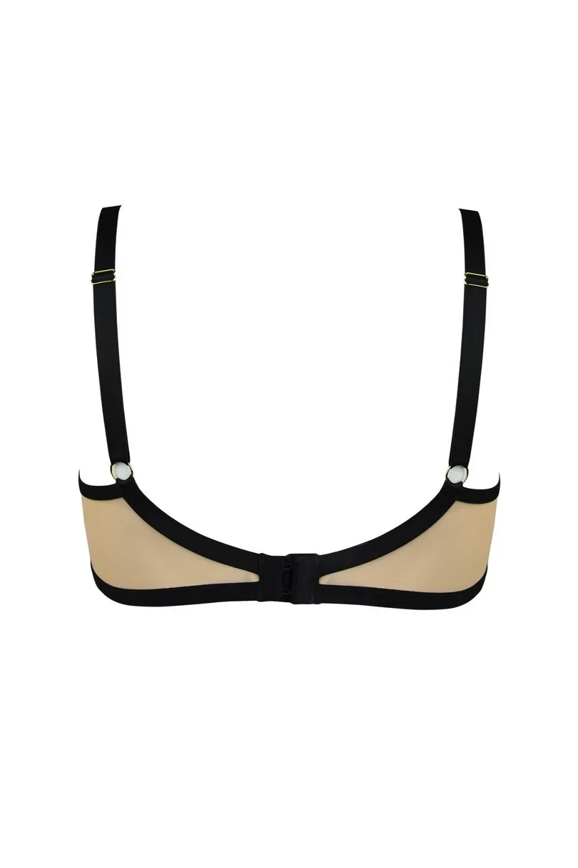 BIUSTONOSZ CABARETTE II 19221 to elegancki biustonosz miękki typu balkonetka, który zachwyca precyzyjnym wykonaniem i luksusowym wykończeniem. Miseczki z delikatnej siatki w odcieniu mokka zostały udekorowane bogatą koronką ze złotą nicią, dodającą całości subtelnego blasku. Czarne lamówki estetycznie podkreślają pionowe cięcia, modelując biust w wyjątkowy sposób. Obwód wykonano z transparentnej beżowej siatki, kontrastującej z czarnymi taśmami, co tworzy nowoczesny i zmysłowy design. Brak bocznych fiszbin zapewnia dodatkowy komfort noszenia. Idealny wybór dla kobiet poszukujących bielizny łączącej piękno z funkcjonalnością. Konstrukcja MS5 DELICE perfekcyjnie eksponuje biust, nadając mu naturalny i pełny kształt.