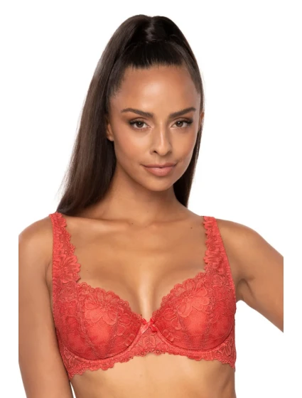 Vyztužená podprsenka z květinové krajky poloměkkého typu. Vnitřní strana košíčků podšitá bavlnou. Boky vyztužené svislými velrybími kosticemi. Ozdobná, nastavitelná ramínka, neodnímatelná. Model dokonale nadnáší a podpírá poprsí.
