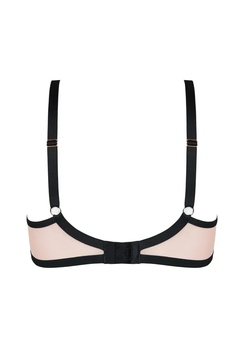 Biustonosz miękki Cabarette II Soft 19220 to esencja luksusu i wyrafinowania, stworzona z myślą o średnich i dużych biustach. Miseczki z beżowej siatki, ozdobione bogatą koronką ze złotą nitką, przyciągają wzrok eleganckim designem. Czarne taśmy dodają modelowi wyrazistego charakteru, idealnie podkreślając kobiece kształty. Obwód wykonany z beżowej siatki zapewnia wygodę, a brak bocznych fiszbin zwiększa komfort noszenia. Konstrukcja MS1 DEZIRO dba o idealne dopasowanie i odpowiednie podtrzymanie biustu. Regulowane ramiączka oraz klasyczne zapięcie na haftki umożliwiają pełną personalizację. To doskonały wybór dla kobiet ceniących połączenie funkcjonalności i zmysłowego wyglądu.