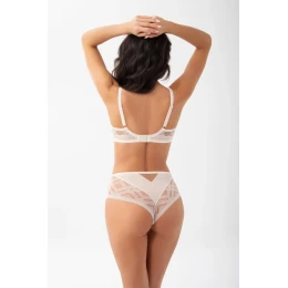 Biustonosz miękki przeznaczony dla kobiet ze średnim i dużym. Zapewnia efekt uniesienia i zebrania biustu do środka, 3-częściowe miski z tiulu stabilnego, pokryte dodatkową warstwą koronki elastycznej. Górna krawędź wykończona gładką taśmą. Dla zwiększenia komfortu użytkowania górna krawędź pasa obwodu wykończona miękkimi lamówkami. Ukryte fiszbiny boczne zapobiegające zwijaniu się materiału. Tył z kryjącej lycry połączonej z koronką elastyczną i tiulem. W zależności od rozmiaru dwu lub trzyrzędowa haftka z trójstopniową regulacją obwodu. Nieodpinane, regulowane ramiączka w trzech szerokościach. Nieodpinane, regulowane ramiączka w trzech szerokościach. Metalowe elementy w kolorze różowego złota (nie zawierają niklu)