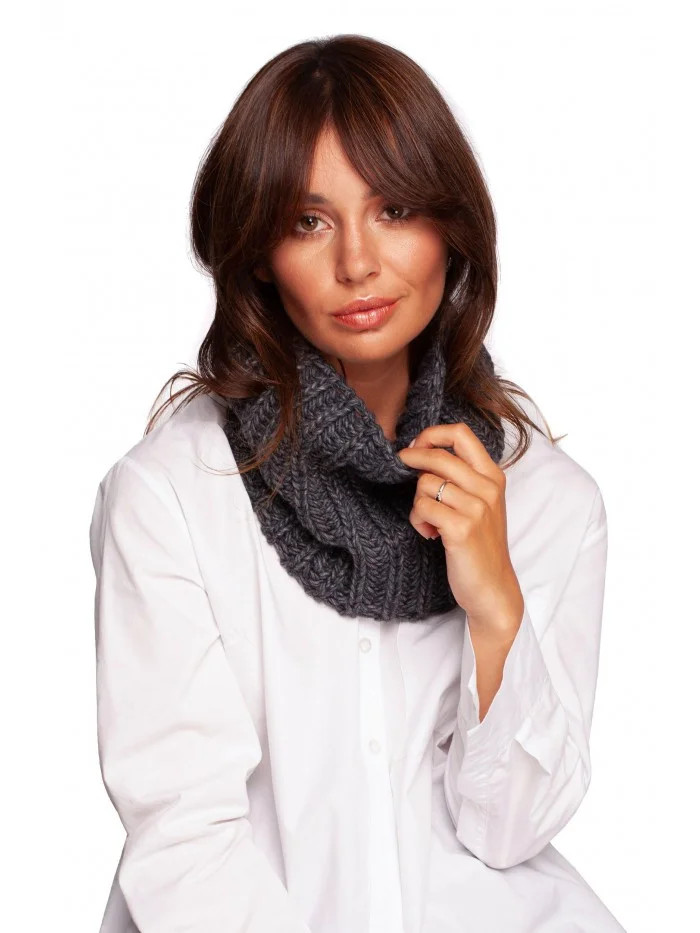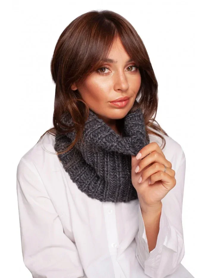 Dámská jednovrstvé komínová šála. Poměrně dlouhý model, který umožňuje ohrnutí jako rolák.