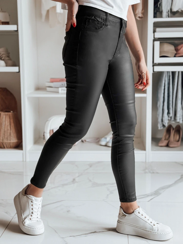 Kalhoty úzkého střihu s koženým efektem jsou moderní nabídkou pro ženy, které ocení minimalismus se šmrncem. Model s klasickým zapínáním na knoflíky, kapsami a vysokým pasem krásně tvaruje pas. Díky elastickému materiálu se pohodlně nosí. Ideální pro stylové jarní komplety.