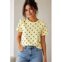 Klasické puntíkované tričko je ideální volbou pro ženy, které si cení pohodlí a nadčasového stylu. Jednoduchý model s krátkým rukávem a kulatým výstřihem dokonale sedí na siluetě a zajišťuje pohodlí po celý den. Jemný puntíkovaný vzor dodává tričku lehkost a dívčí šarm, takže se skvěle hodí k ležérním outfitům. Tričko je vyrobeno z měkkého materiálu příjemného na dotek, hodí se na každodenní nošení i setkání s přáteli a skvěle se hodí k džínům, šortkám nebo sukni.