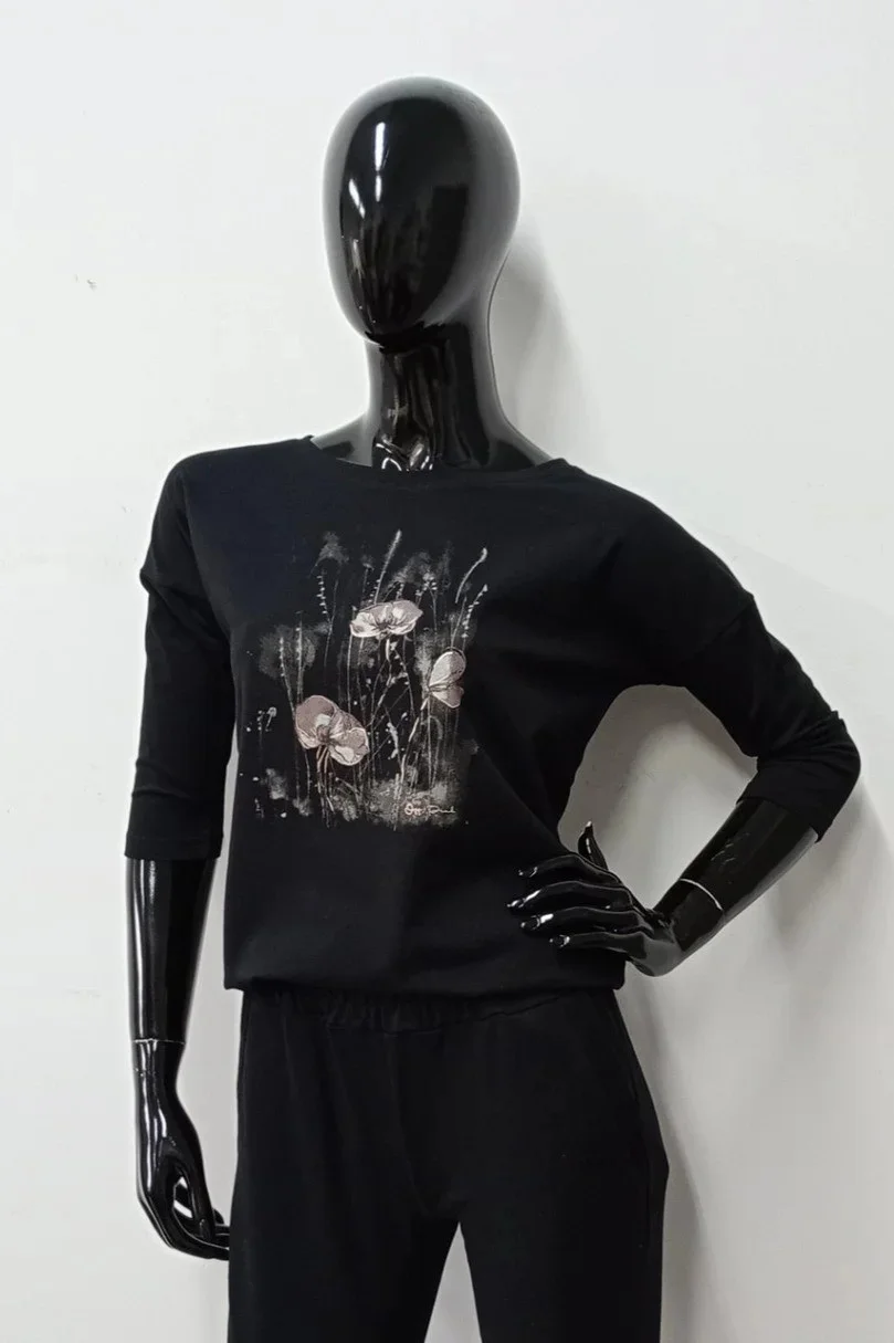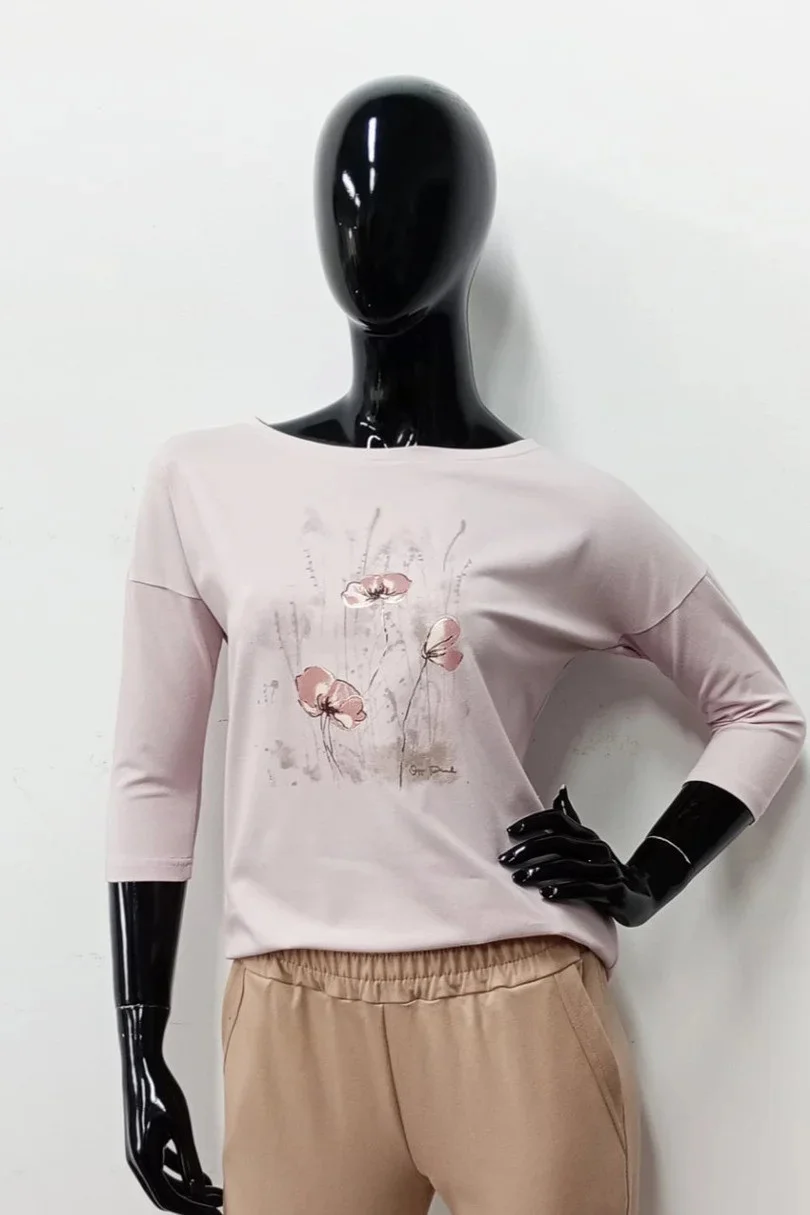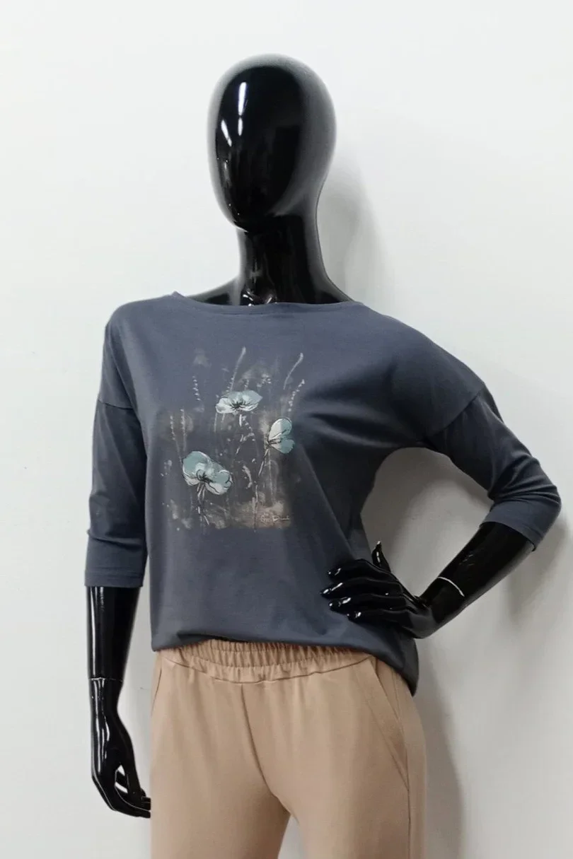 Halenka Margo má 3/4 dlouhé rukávy pro lehký a univerzální vzhled, delší, zaoblená záda pro pohodlný a stylový vzhled, který se dobře kombinuje se střihem na míru. Na přední straně halenky je jemný květinový potisk, který jí dodává jemný, romantický nádech.