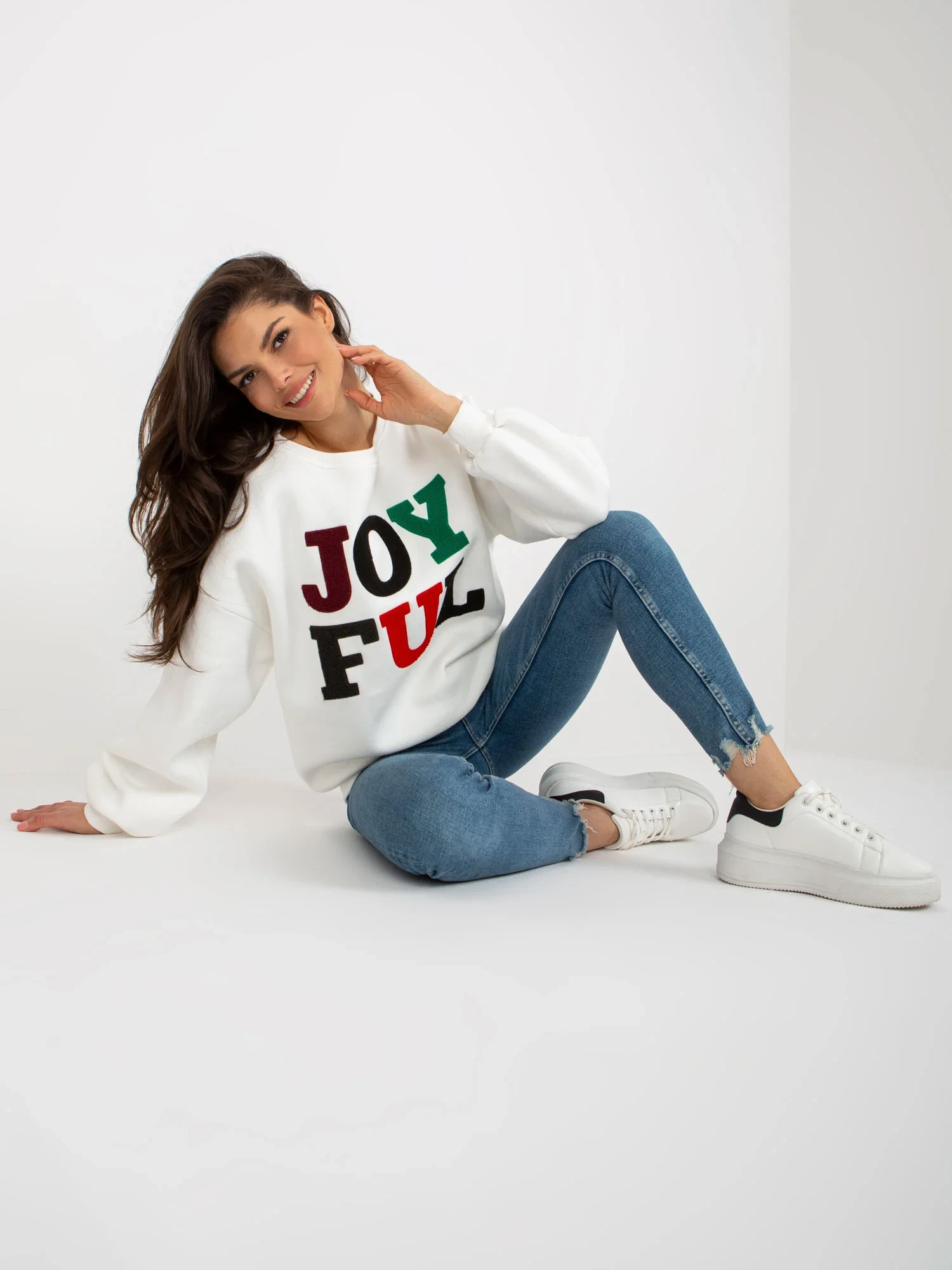 Wymiary bluzy w rozmiarze one size mierzone na płasko: szerokość pod pachami - 57 cm, długość rękawa - 60 cm, długość całkowita - 71 cm.