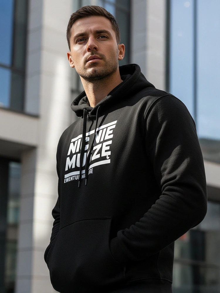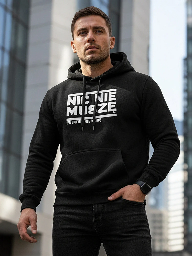 Bluza męska z kapturem z napisem NIC NIE MUSZĘ to model wpisujący się w nowoczesny styl streetwear. Wyrazisty nadruk nadaje charakteru i przyciąga uwagę, podkreślając indywidualne podejście do mody. Klasyczny fason sprawia, że bluza dobrze komponuje się z codziennymi stylizacjami. To praktyczny wybór dla osób ceniących wygodę i wyrazisty design.