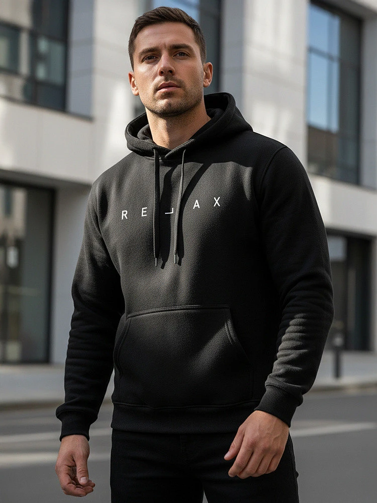 Bluza męska z kapturem z napisem RELAX to propozycja dla osób ceniących wygodę i nowoczesny, miejski styl. Prosty fason w połączeniu z wyrazistym nadrukiem tworzy spójną i uniwersalną całość. Model dobrze wpisuje się w codzienną garderobę i pasuje do wielu stylizacji. Sprawdzi się jako praktyczny element ubioru na co dzień, niezależnie od pory roku.