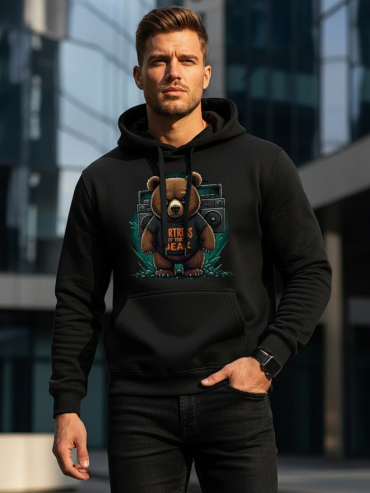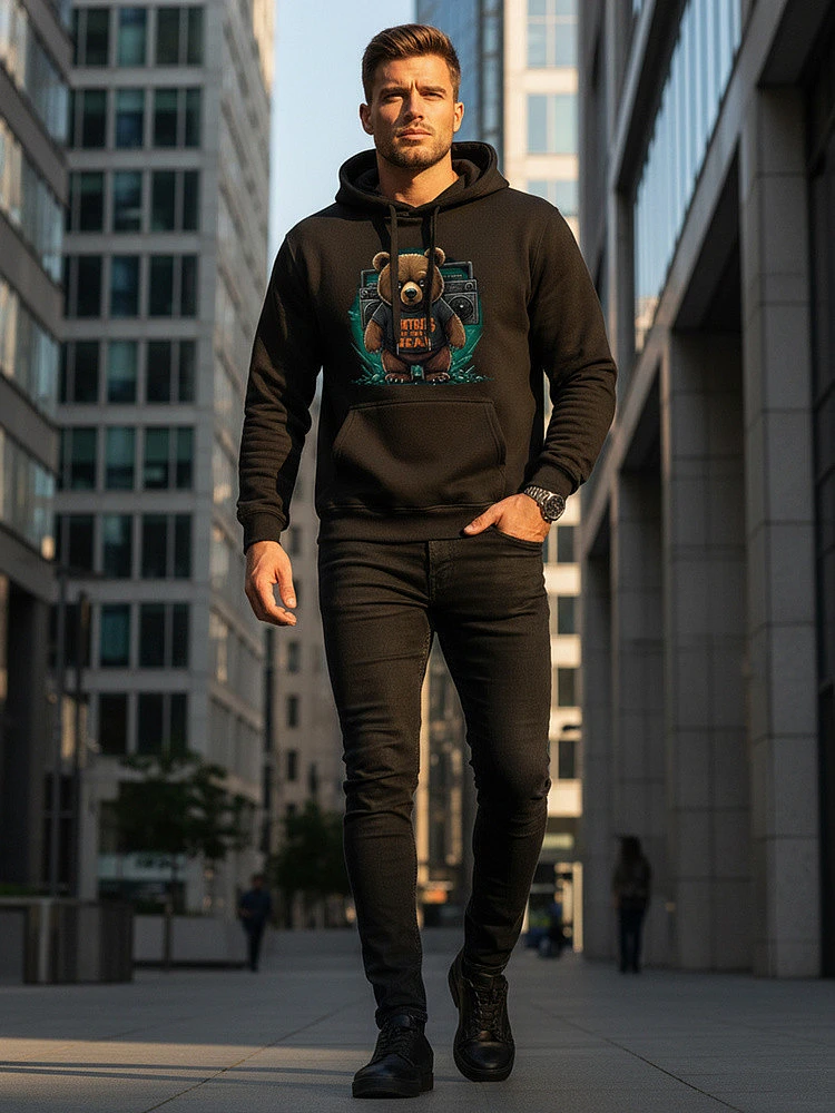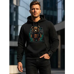 Bluza męska z kapturem FORTRESS OF THE BEAR to model dla osób, które szukają wygodnej odzieży z wyrazistym nadrukiem i nowoczesnym charakterem. Grafika inspirowana miejskim stylem nadaje całości oryginalny wygląd i wyróżnia ją na tle klasycznych fasonów. Uniwersalny krój sprawia, że bluza dobrze prezentuje się w codziennych zestawach i łatwo dopasować ją do różnych elementów garderoby. To praktyczna propozycja dla mężczyzn ceniących komfort oraz mocny akcent wizualny.