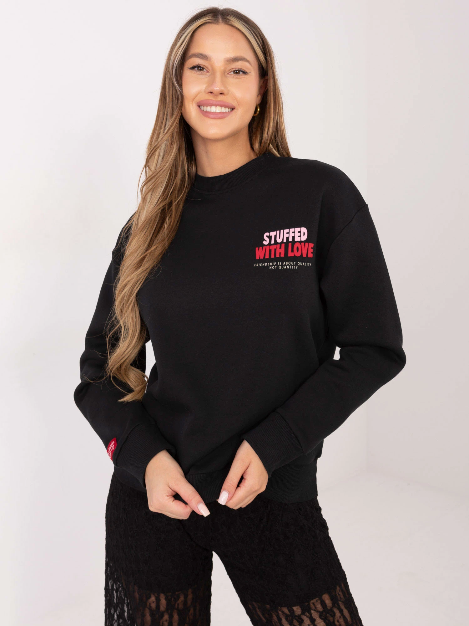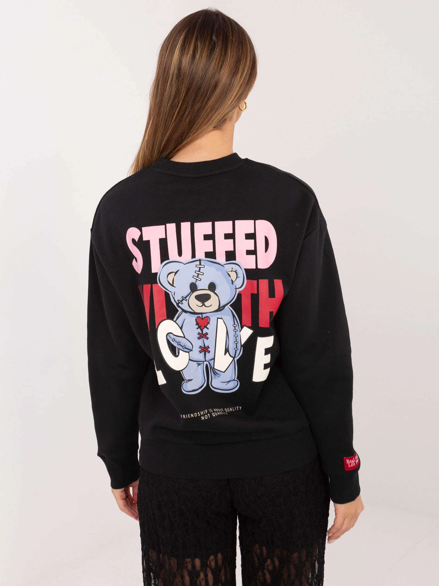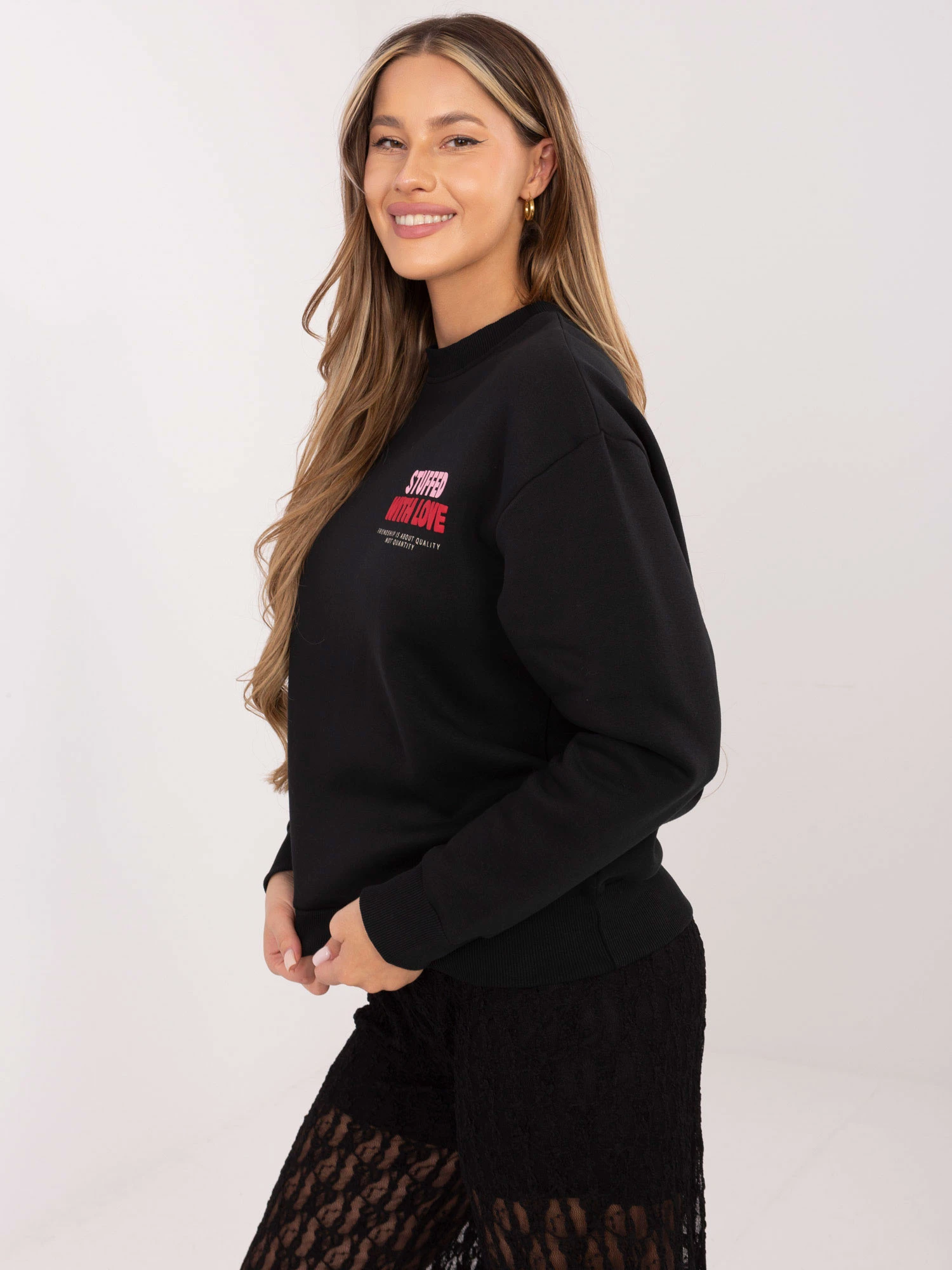 Wymiary bluzy w rozmiarze S mierzone na płasko: szerokość pod pachami - 56 cm, długość całkowita - 62 cm, szerokość na dole - 43 cm, długość rękawa - 57 cm (od szwu).