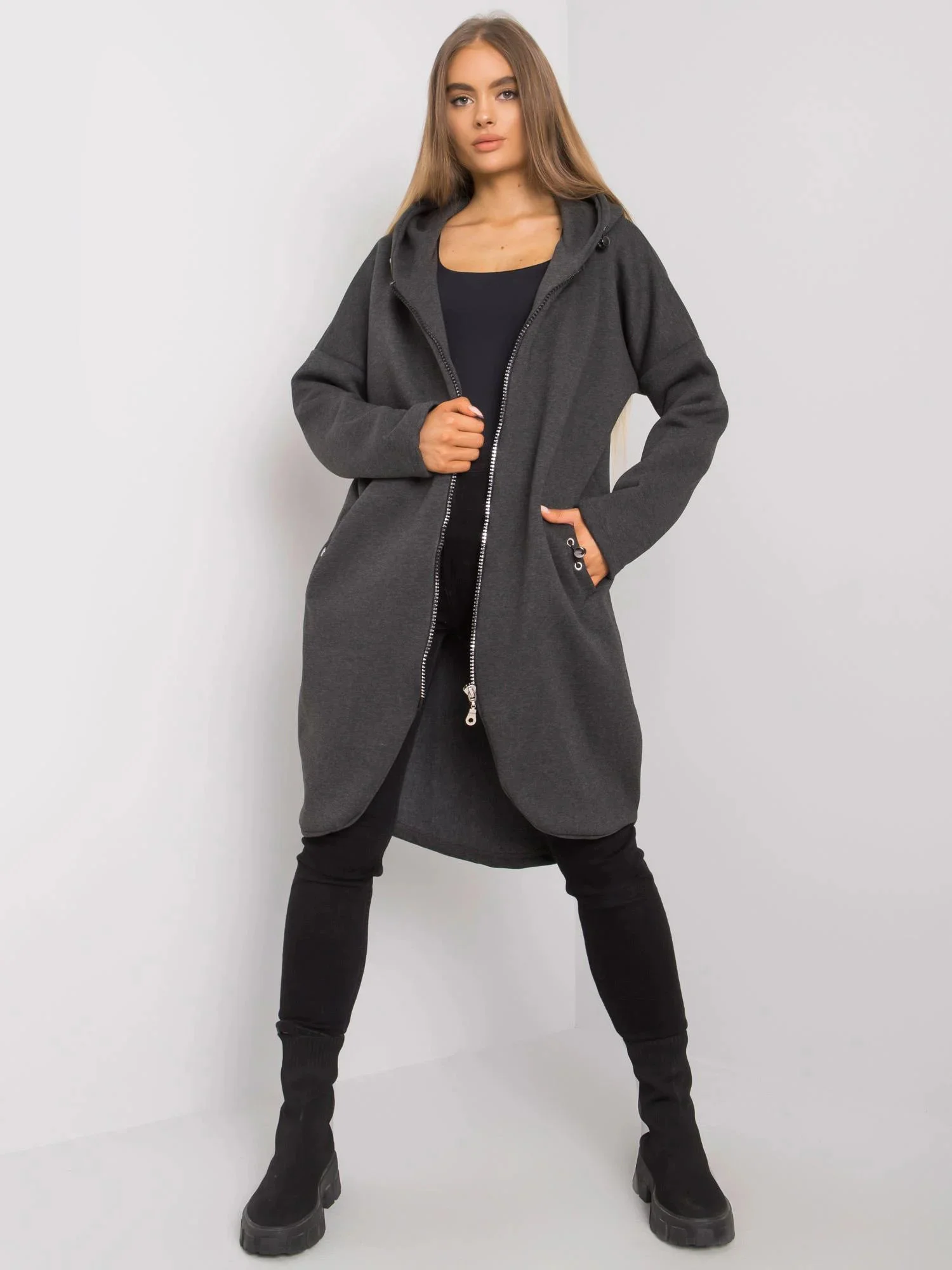 RUE PARIS Grafitowa długa bluza z kapturem.