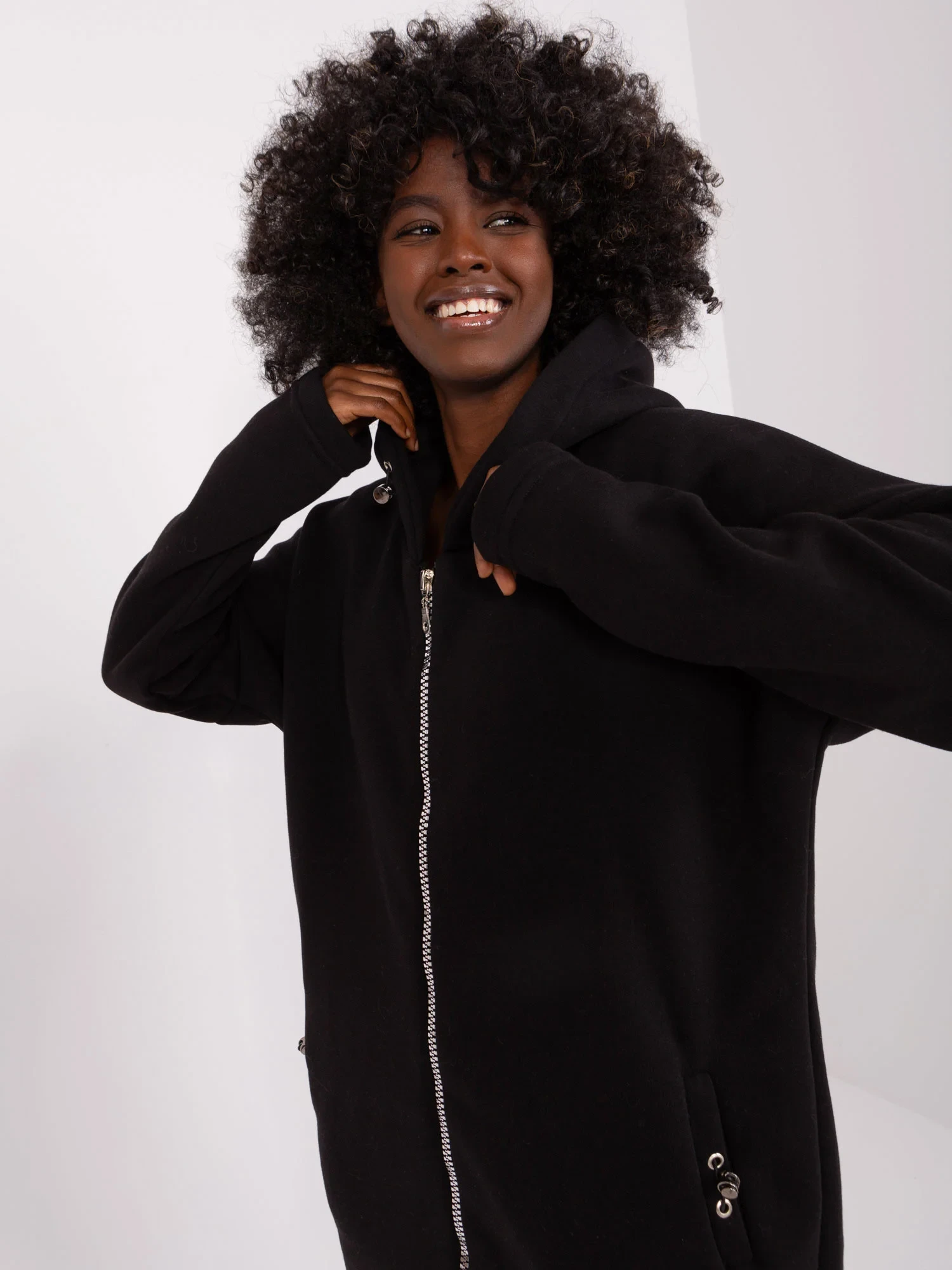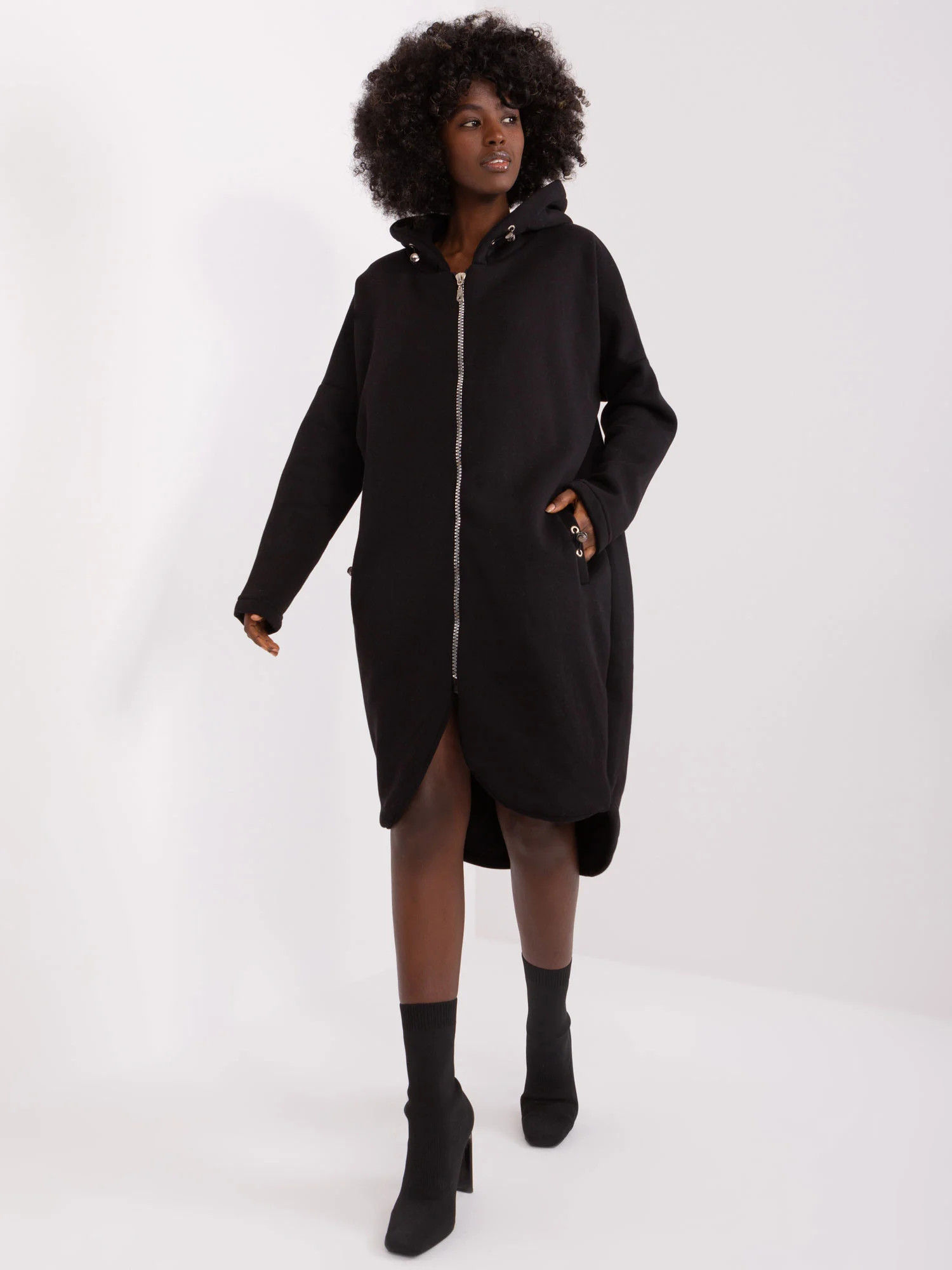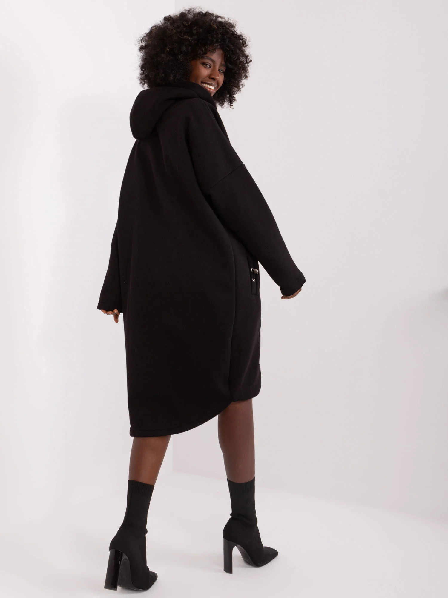 Wymiary bluzy w rozmiarze S/M mierzone na płasko: szerokość pod pachami - 66 cm, długość całkowita - 88 cm (przód), długość całkowita - 99 cm (tył), długość rękawa - 61 cm.