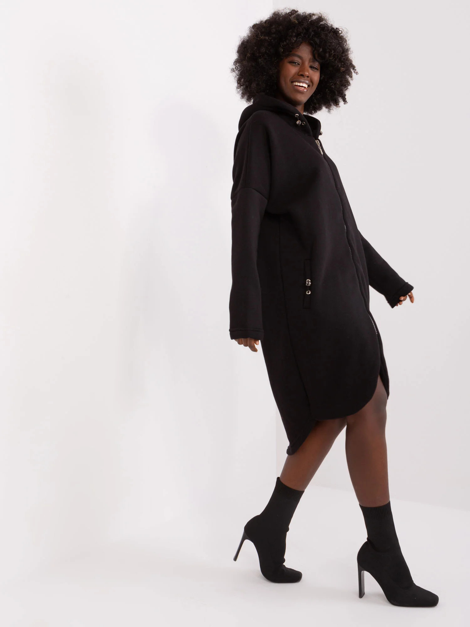 Modelka ma na sobie rozmiar S/M. Wymiary modelki: wzrost 168 cm, biust 82 cm, talia 62 cm, biodra 93 cm.